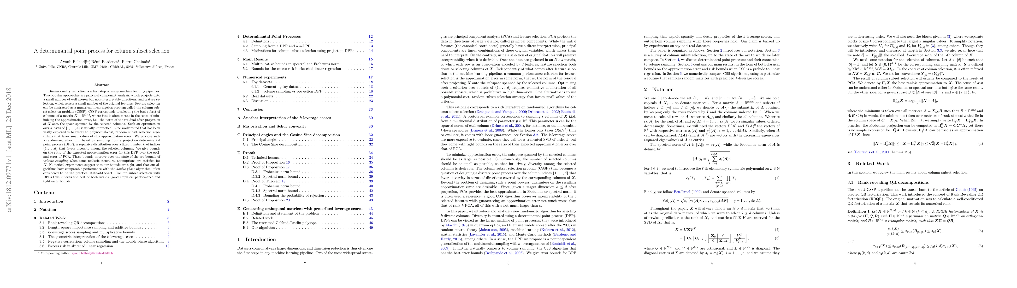 The paper proposes a randomized algorithm for dimensionality reduction, called Column Subset Selection Problem (CSSP), using a Determinantal Point Process (DPP). This method favors diverse column selection and offers error bounds improving upon existing techniques, with numerical experiments indicating competitive performance to current state-of-the-art methods.