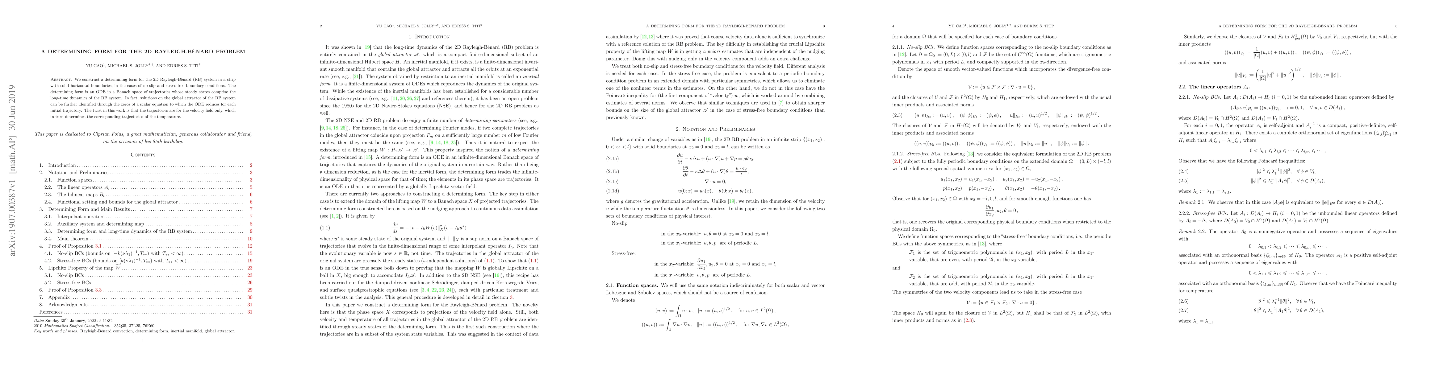 We construct a determining form for the 2D Rayleigh-B\'enard (RB) system in a strip with solid horizontal boundaries, in the cases of no-slip and stress-free boundary conditions. The determining form is an ODE in a Banach space of trajectories whose steady states comprise the long-time dynamics of the RB system. In fact, solutions on the global attractor of the RB system can be further identified through the zeros of a scalar equation to which the ODE reduces for each initial trajectory. The twist in this work is that the trajectories are for the velocity field only, which in turn determines the corresponding trajectories of the temperature.
