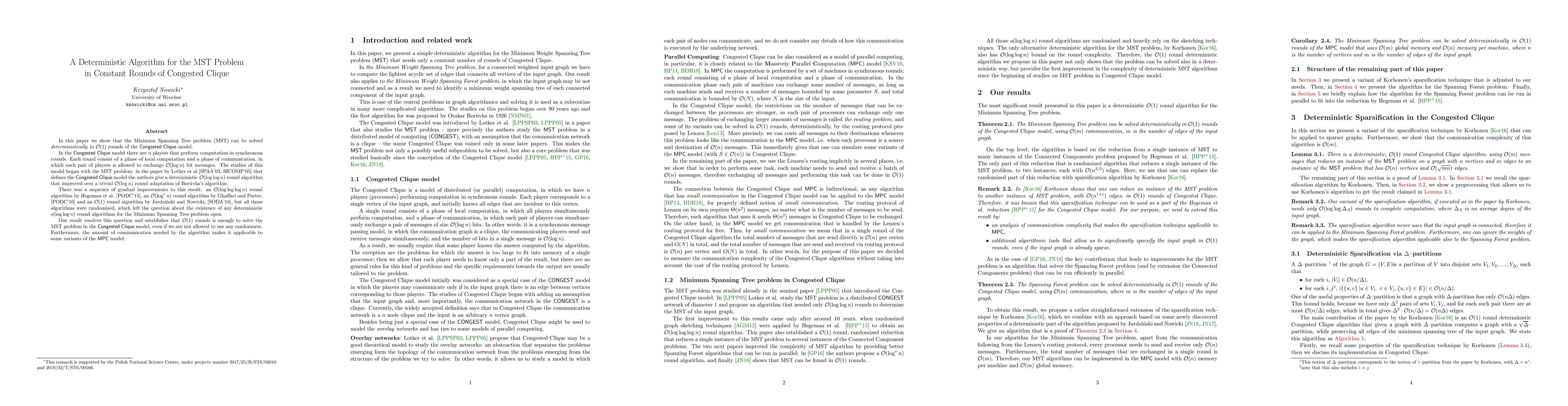 The introduction of a deterministic algorithm for solving MST in constant rounds in the Congested Clique model, utilizing a sparsification technique and parallel execution of spanning forest algorithms.