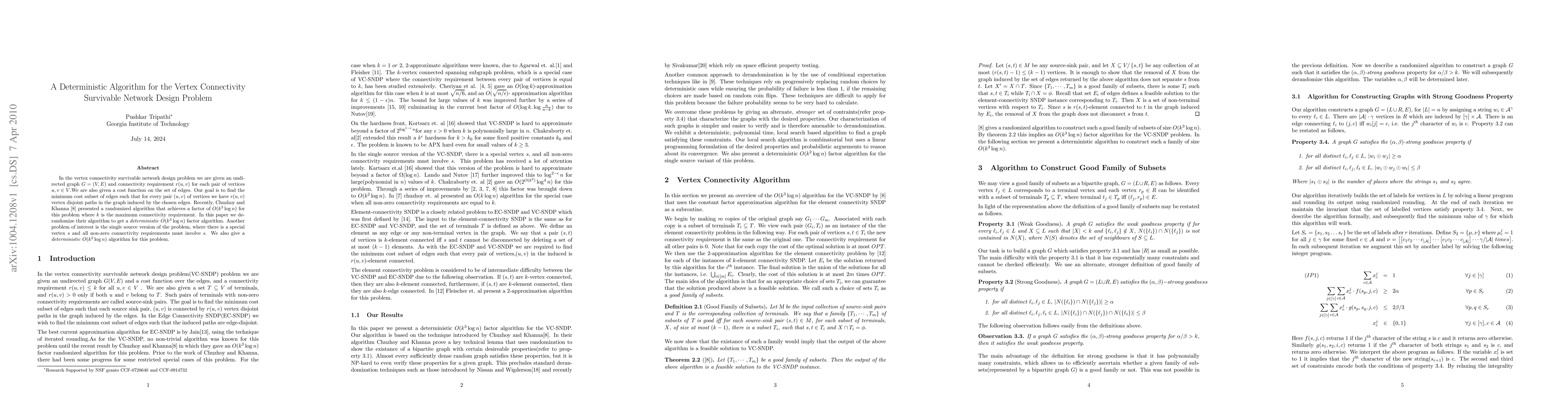 This paper presents a deterministic algorithm achieving an O(k^3 log n) factor for the vertex connectivity survivable network design problem, derandomizing a previous randomized approach. It also provides a deterministic O(k^2 log n) algorithm for the single source version of the problem.