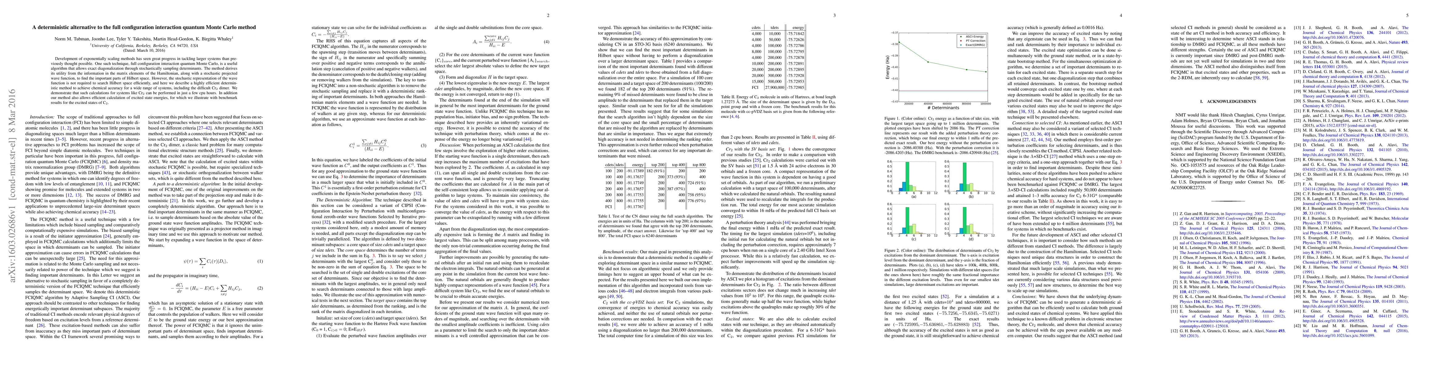 This paper introduces a deterministic method that provides an alternative to the full configuration interaction quantum Monte Carlo method, achieving chemical accuracy for various systems, including the Cr$_{2}$ dimer, while also efficiently calculating excited state energies, as demonstrated by benchmark results for C$_{2}$. The deterministic approach eliminates the need for stochastic representation, enhancing computational efficiency.