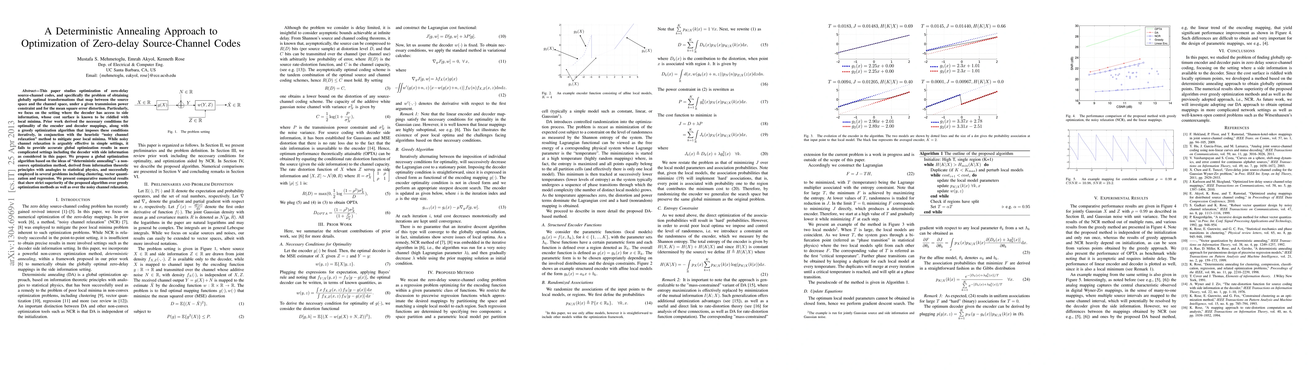 This paper proposes a deterministic annealing approach for optimizing zero-delay source-channel codes, addressing the challenge of finding globally optimal transformations under transmission constraints. The method outperforms existing greedy and relaxation-based algorithms, especially in complex scenarios with decoder side information.
