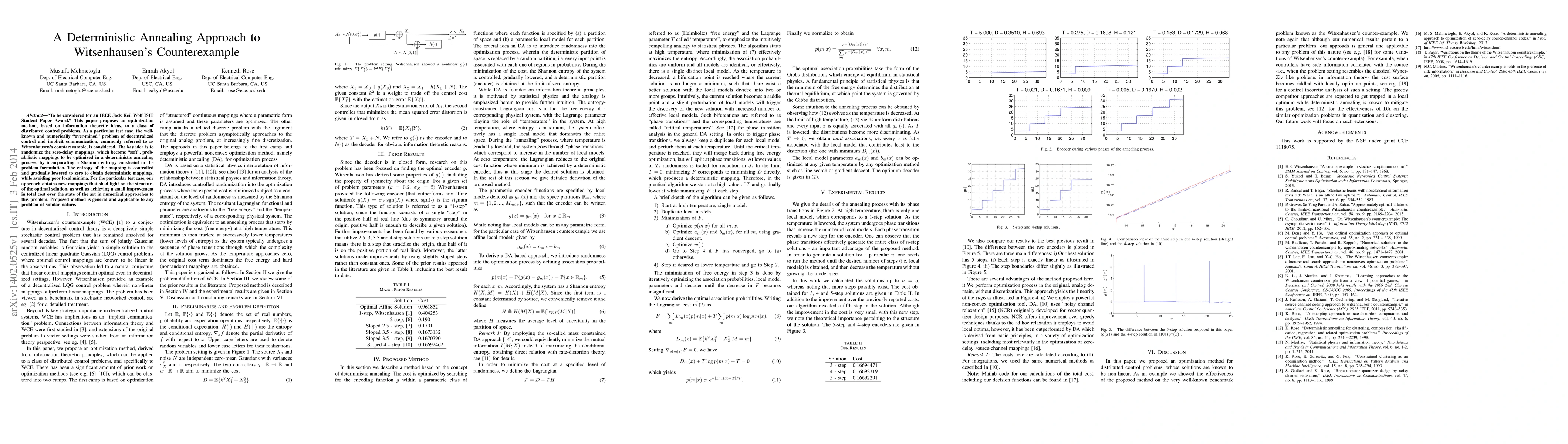 This paper introduces a deterministic annealing method, incorporating Shannon entropy constraints, to improve numerical solutions for Witsenhausen's counterexample in decentralized control. The approach randomizes and optimizes probabilistic mappings, leading to a small enhancement over existing results and insights into the optimal solution structure.