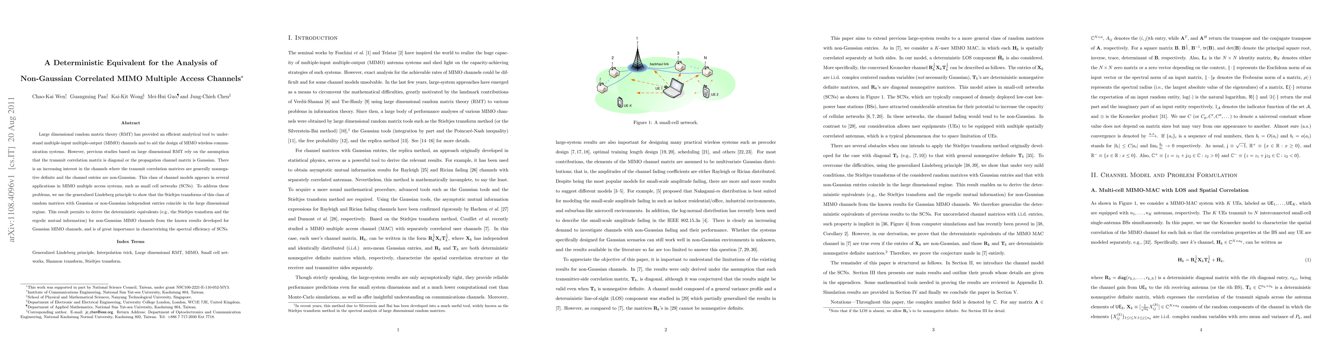 Large dimensional random matrix theory (RMT) has provided an efficient analytical tool to understand multiple-input multiple-output (MIMO) channels and to aid the design of MIMO wireless communication systems. However, previous studies based on large dimensional RMT rely on the assumption that the transmit correlation matrix is diagonal or the propagation channel matrix is Gaussian. There is an increasing interest in the channels where the transmit correlation matrices are generally nonnegative definite and the channel entries are non-Gaussian. This class of channel models appears in several applications in MIMO multiple access systems, such as small cell networks (SCNs). To address these problems, we use the generalized Lindeberg principle to show that the Stieltjes transforms of this class of random matrices with Gaussian or non-Gaussian independent entries coincide in the large dimensional regime. This result permits to derive the deterministic equivalents (e.g., the Stieltjes transform and the ergodic mutual information) for non-Gaussian MIMO channels from the known results developed for Gaussian MIMO channels, and is of great importance in characterizing the spectral efficiency of SCNs.