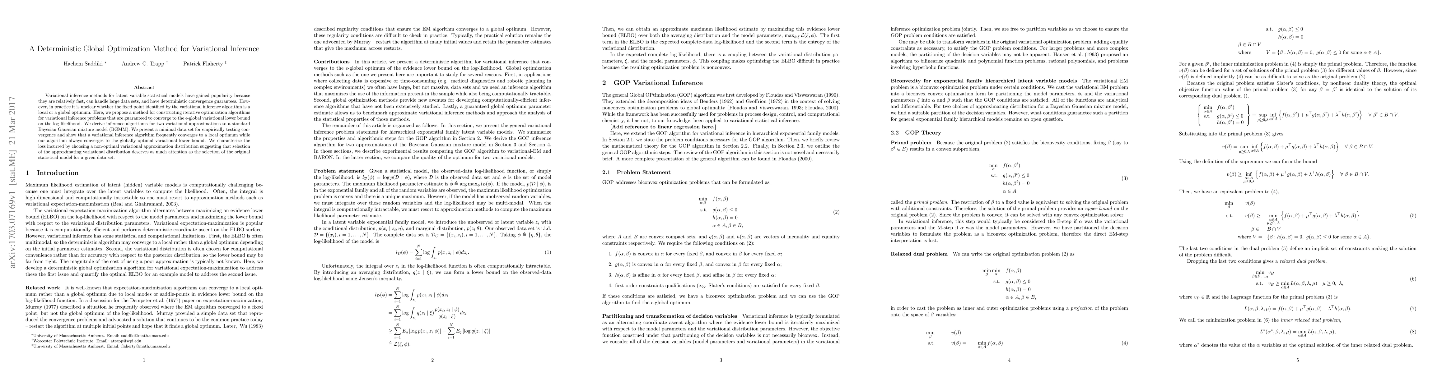 This paper proposes a deterministic global optimization method for variational inference that guarantees convergence to the $\epsilon$-global variational lower bound, contrasting with existing methods that often converge to local optima. The authors demonstrate their method's effectiveness through inference algorithms for a Bayesian Gaussian mixture model and show it consistently finds the global optimum, highlighting the importance of selecting appropriate variational approximations.