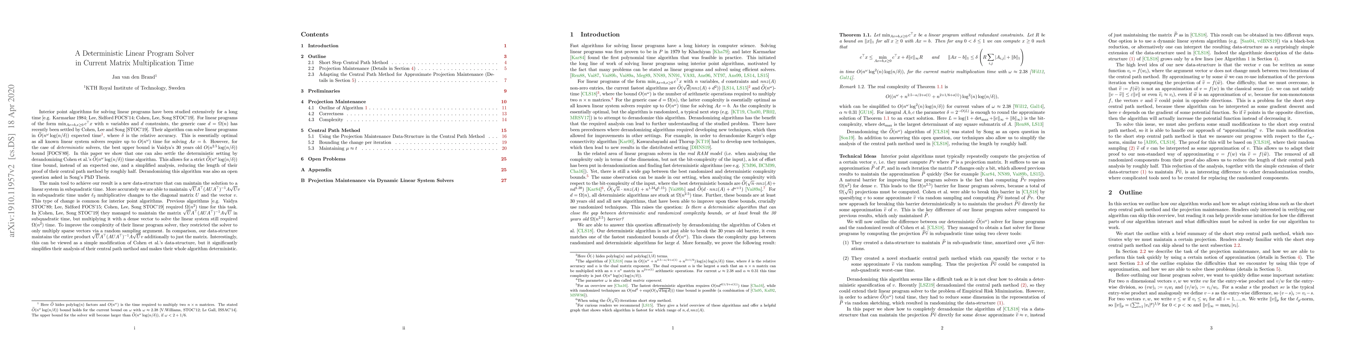 Interior point algorithms for solving linear programs have been studied extensively for a long time [e.g. Karmarkar 1984; Lee, Sidford FOCS'14; Cohen, Lee, Song STOC'19]. For linear programs of the form $\min_{Ax=b, x \ge 0} c^\top x$ with $n$ variables and $d$ constraints, the generic case $d = \Omega(n)$ has recently been settled by Cohen, Lee and Song [STOC'19]. Their algorithm can solve linear programs in $\tilde O(n^\omega \log(n/\delta))$ expected time, where $\delta$ is the relative accuracy. This is essentially optimal as all known linear system solvers require up to $O(n^{\omega})$ time for solving $Ax = b$. However, for the case of deterministic solvers, the best upper bound is Vaidya's 30 years old $O(n^{2.5} \log(n/\delta))$ bound [FOCS'89]. In this paper we show that one can also settle the deterministic setting by derandomizing Cohen et al.'s $\tilde{O}(n^\omega \log(n/\delta))$ time algorithm. This allows for a strict $\tilde{O}(n^\omega \log(n/\delta))$ time bound, instead of an expected one, and a simplified analysis, reducing the length of their proof of their central path method by roughly half. Derandomizing this algorithm was also an open question asked in Song's PhD Thesis. The main tool to achieve our result is a new data-structure that can maintain the solution to a linear system in subquadratic time. More accurately we are able to maintain $\sqrt{U}A^\top(AUA^\top)^{-1}A\sqrt{U}\:v$ in subquadratic time under $\ell_2$ multiplicative changes to the diagonal matrix $U$ and the vector $v$. This type of change is common for interior point algorithms. Previous algorithms [e.g. Vaidya STOC'89; Lee, Sidford FOCS'15; Cohen, Lee, Song STOC'19] required $\Omega(n^2)$ time for this task. [...]
