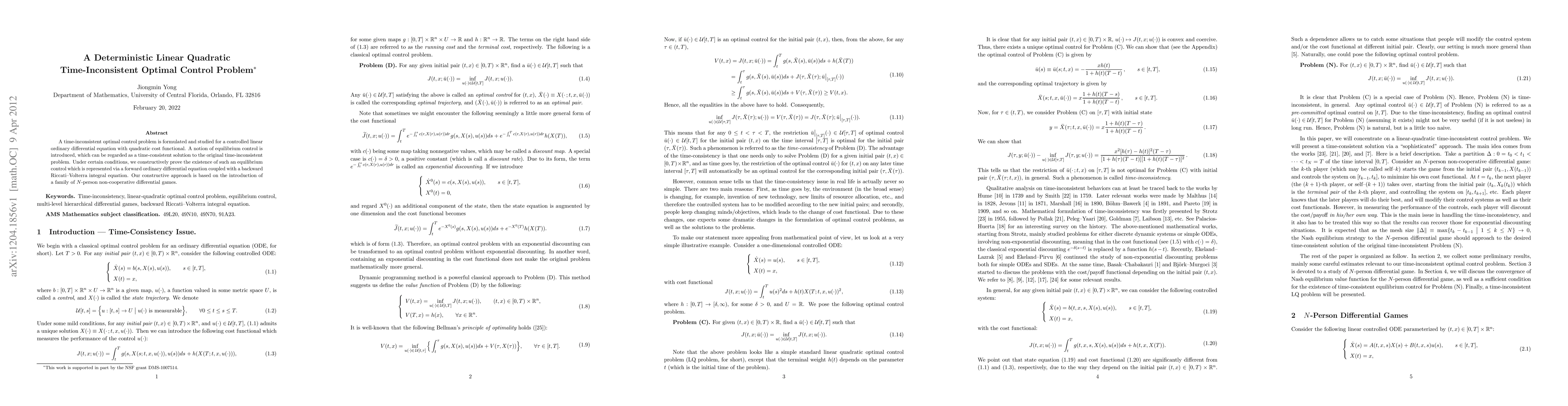 A time-inconsistent optimal control problem is formulated and studied for a controlled linear ordinary differential equation with quadratic cost functional. A notion of equilibrium control is introduced, which can be regarded as a time-consistent solution to the original time-inconsistent problem. Under certain conditions, we constructively prove the existence of such an equilibrium control which is represented via a forward ordinary differential equation coupled with a backward Riccati--Volterra integral equation. Our constructive approach is based on the introduction of a family of $N$-person non-cooperative differential games.