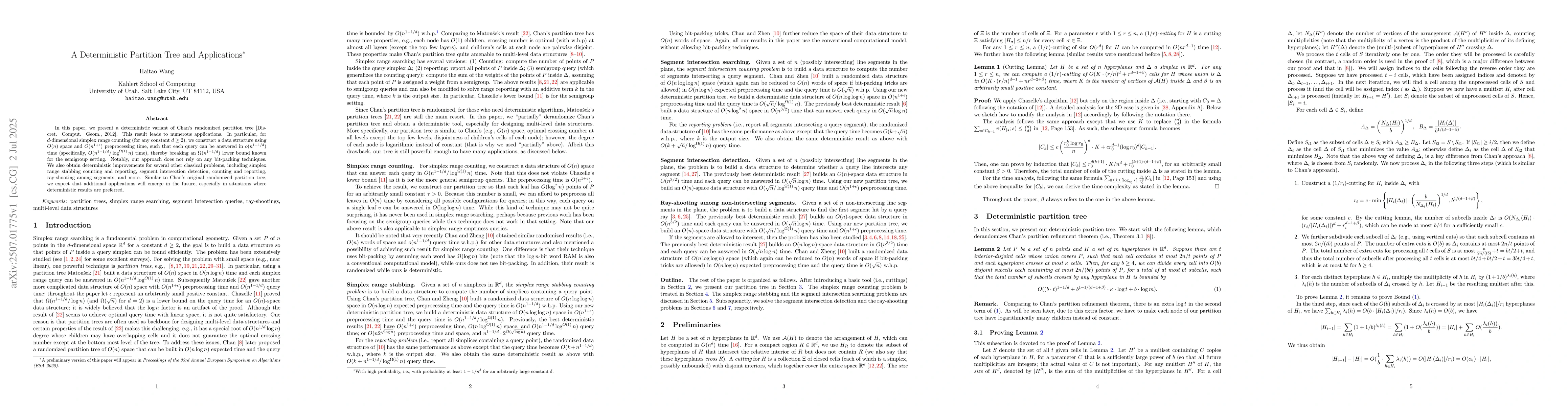 In this paper, we present a deterministic variant of Chan's randomized partition tree [Discret. Comput. Geom., 2012]. This result leads to numerous applications. In particular, for $d$-dimensional simplex range counting (for any constant $d \ge 2$), we construct a data structure using $O(n)$ space and $O(n^{1+\epsilon})$ preprocessing time, such that each query can be answered in $o(n^{1-1/d})$ time (specifically, $O(n^{1-1/d} / \log^{\Omega(1)} n)$ time), thereby breaking an $\Omega(n^{1-1/d})$ lower bound known for the semigroup setting. Notably, our approach does not rely on any bit-packing techniques. We also obtain deterministic improvements for several other classical problems, including simplex range stabbing counting and reporting, segment intersection detection, counting and reporting, ray-shooting among segments, and more. Similar to Chan's original randomized partition tree, we expect that additional applications will emerge in the future, especially in situations where deterministic results are preferred.