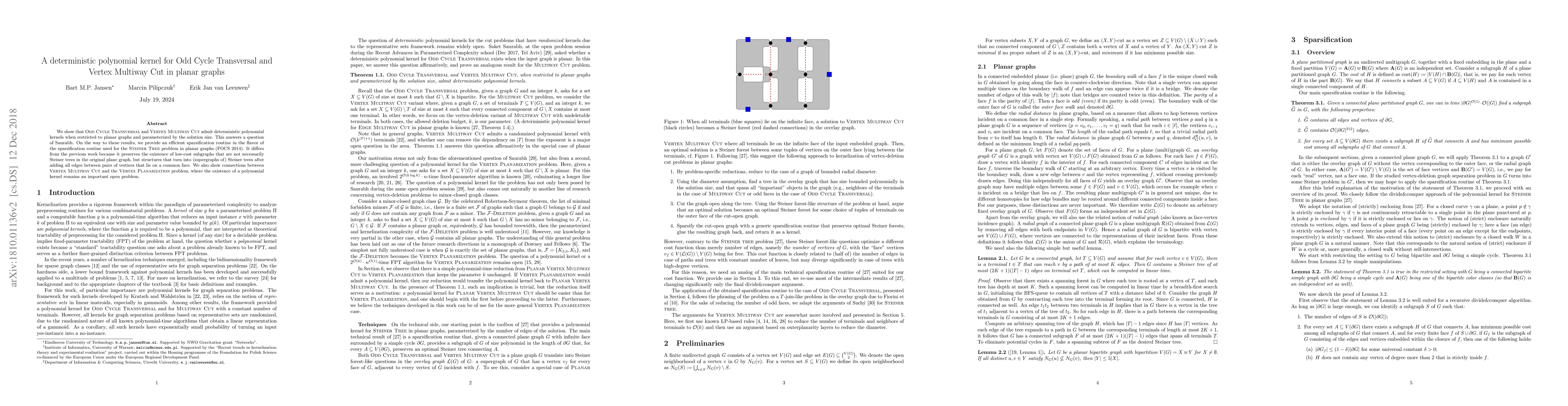 This paper demonstrates that Odd Cycle Transversal and Vertex Multiway Cut problems have deterministic polynomial kernels when restricted to planar graphs and parameterized by solution size. It introduces a novel sparsification routine that preserves low-cost subgraphs, providing insights into the Vertex Planarization problem.