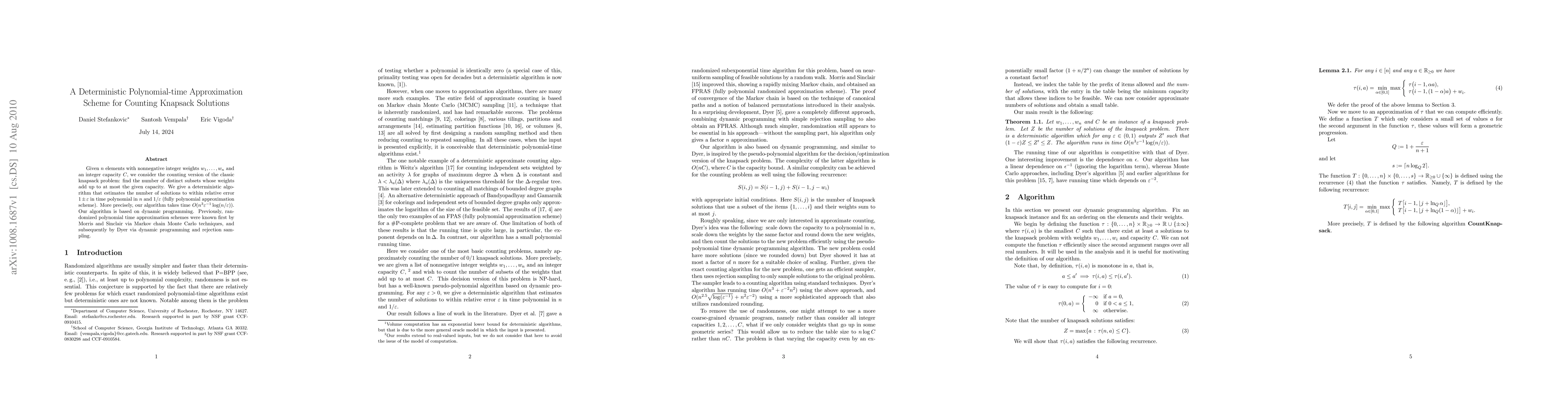 This paper presents a deterministic polynomial-time approximation scheme for counting the number of knapsack solutions, achieving relative error within 1±ε in time O(n^3 (1/ε) log (n/ε)), improving upon previous randomized methods. The algorithm leverages dynamic programming.
