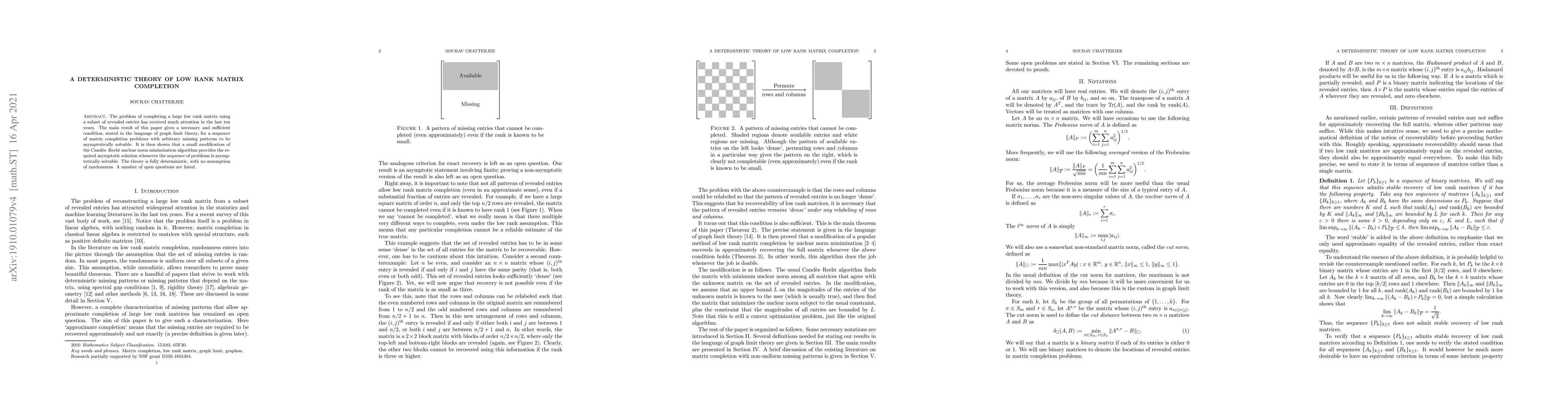 This paper presents a deterministic theory for low rank matrix completion, providing a necessary and sufficient condition for asymptotic solvability using graph limit theory. It also demonstrates that a modified nuclear norm minimization algorithm can achieve the required solution under these conditions.
