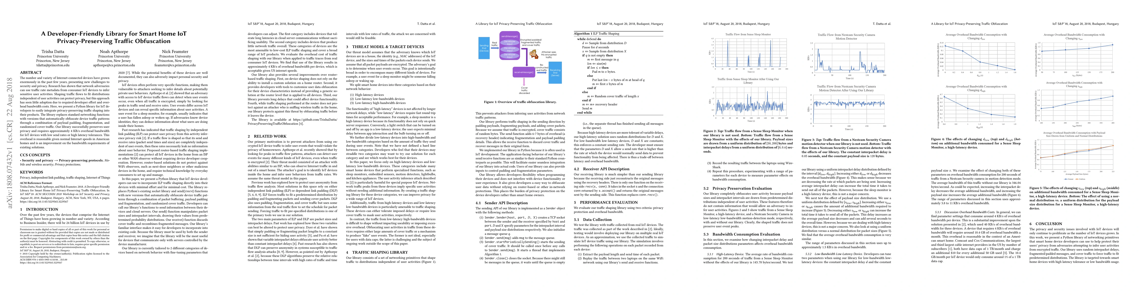 This paper introduces a Python library to help IoT developers integrate privacy-preserving traffic obfuscation into their smart home devices, using techniques like payload padding and fragmentation to protect user activities from network adversaries. The library achieves this with minimal bandwidth overhead of approximately 4 KB/s.