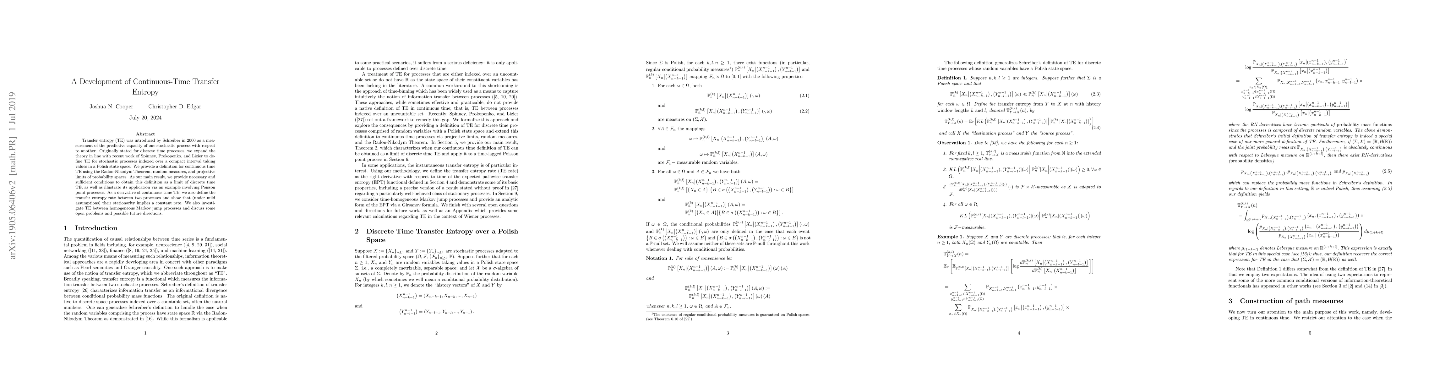 Transfer entropy (TE) was introduced by Schreiber in 2000 as a measurement of the predictive capacity of one stochastic process with respect to another. Originally stated for discrete time processes, we expand the theory in line with recent work of Spinney, Prokopenko, and Lizier to define TE for stochastic processes indexed over a compact interval taking values in a Polish state space. We provide a definition for continuous time TE using the Radon-Nikodym Theorem, random measures, and projective limits of probability spaces. As our main result, we provide necessary and sufficient conditions to obtain this definition as a limit of discrete time TE, as well as illustrate its application via an example involving Poisson point processes. As a derivative of continuous time TE, we also define the transfer entropy rate between two processes and show that (under mild assumptions) their stationarity implies a constant rate. We also investigate TE between homogeneous Markov jump processes and discuss some open problems and possible future directions.