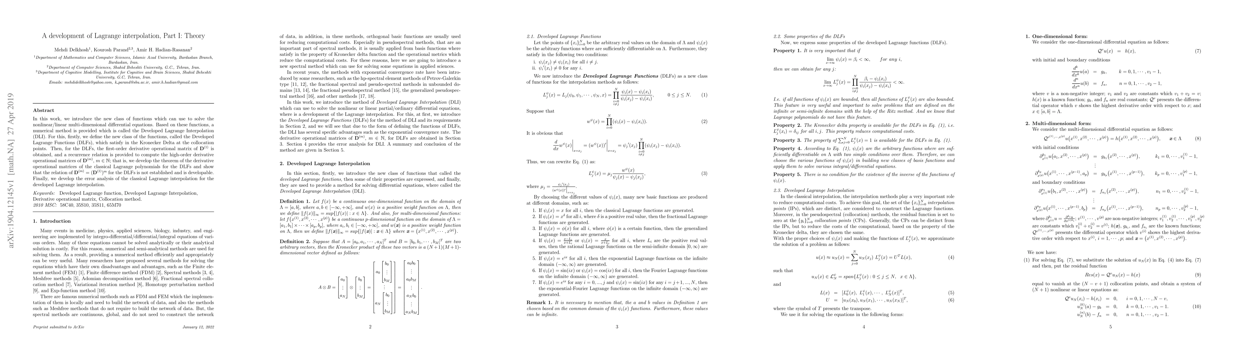In this work, we introduce the new class of functions which can use to solve the nonlinear/linear multi-dimensional differential equations. Based on these functions, a numerical method is provided which is called the Developed Lagrange Interpolation (DLI). For this, firstly, we define the new class of the functions, called the Developed Lagrange Functions (DLFs), which satisfy in the Kronecker Delta at the collocation points. Then, for the DLFs, the first-order derivative operational matrix of $\textbf{D}^{(1)}$ is obtained, and a recurrence relation is provided to compute the high-order derivative operational matrices of $\textbf{D}^{(m)}$, $m\in \mathbb{N}$; that is, we develop the theorem of the derivative operational matrices of the classical Lagrange polynomials for the DLFs and show that the relation of $\textbf{D}^{(m)}=(\textbf{D}^{(1)})^{m}$ for the DLFs is not established and is developable. Finally, we develop the error analysis of the classical Lagrange interpolation for the developed Lagrange interpolation. Finally, for demonstrating the convergence and efficiency of the DLI, some well-known differential equations, which are applicable in applied sciences, have been investigated based upon the various choices of the points of interpolation/collocation.