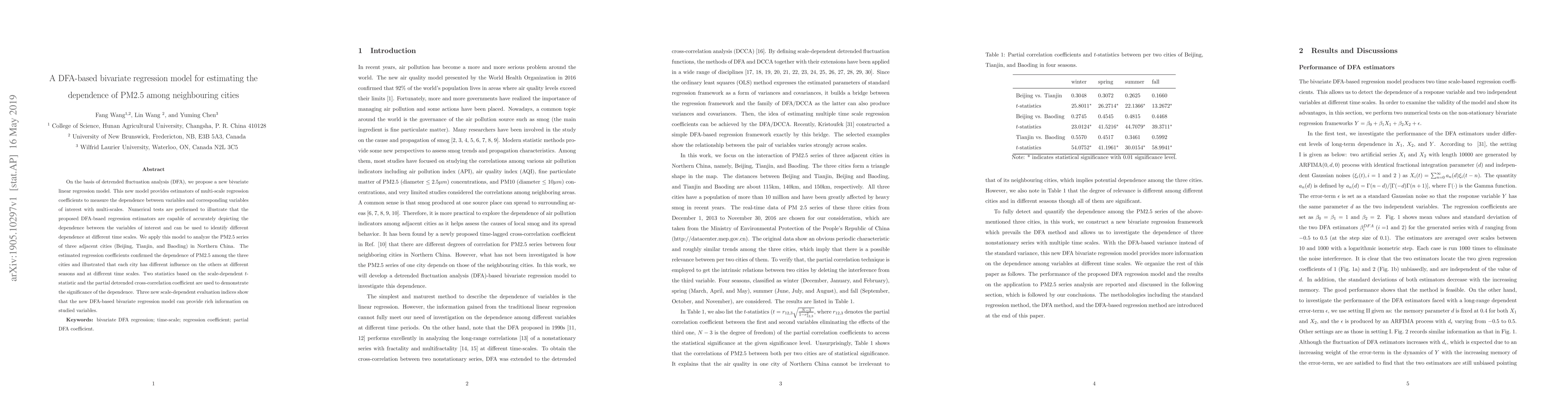 A new bivariate regression model using DFA is proposed to estimate dependence between PM2.5 levels in neighboring cities, revealing seasonal and time-scale differences in influence.