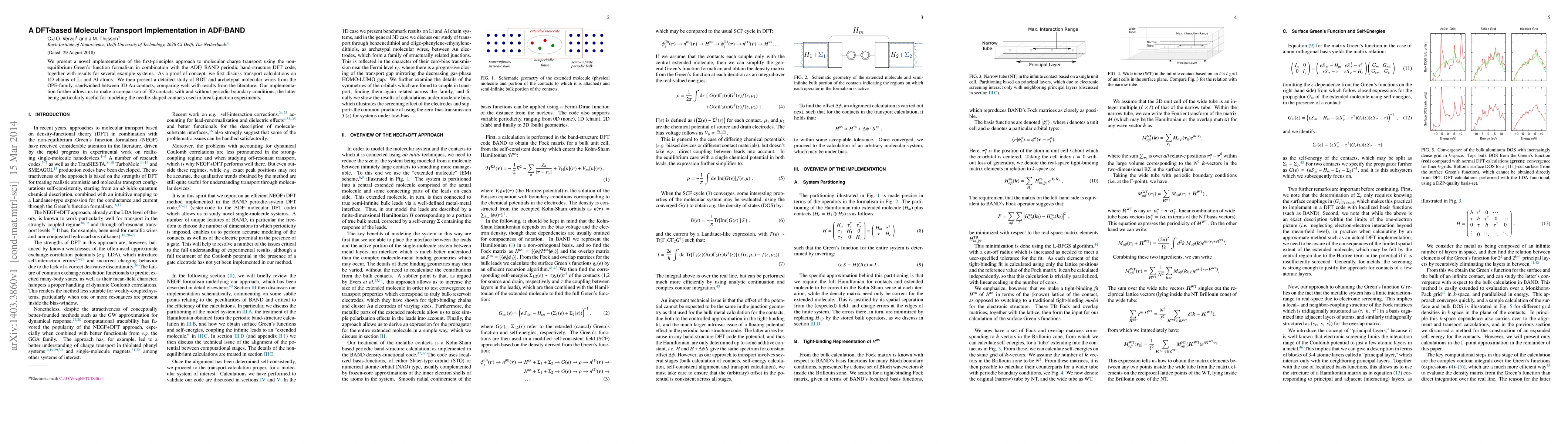 We present a novel implementation of the first-principles approach to molecular charge transport using the non-equilibrium Green's function formalism in combination with the ADF/BAND periodic band-structure DFT code, together with results for several example systems. As a proof of concept, we first discuss transport calculations on 1D chains of Li and Al atoms. We then present a detailed study of BDT and archetypal molecular wires from the OPE-family, sandwiched between 3D Au contacts, comparing well with results from the literature. Our implementation further allows us to make a comparison of 3D contacts with and without periodic boundary conditions, the latter being particularly useful for modeling the needle-shaped contacts used in break-junction experiments.
