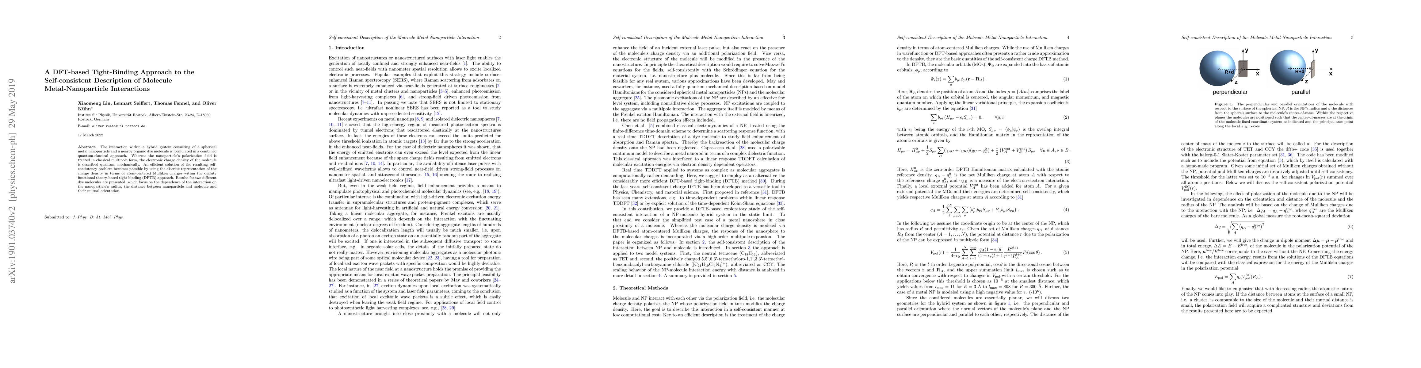 This paper proposes a DFT-based tight-binding method to describe interactions between organic dye molecules and spherical metal nanoparticles. The method combines quantum mechanical treatment of the molecule with classical multipole treatment of the nanoparticle, enabling efficient self-consistent calculations and revealing the influence of nanoparticle size, distance, and orientation on the interaction.