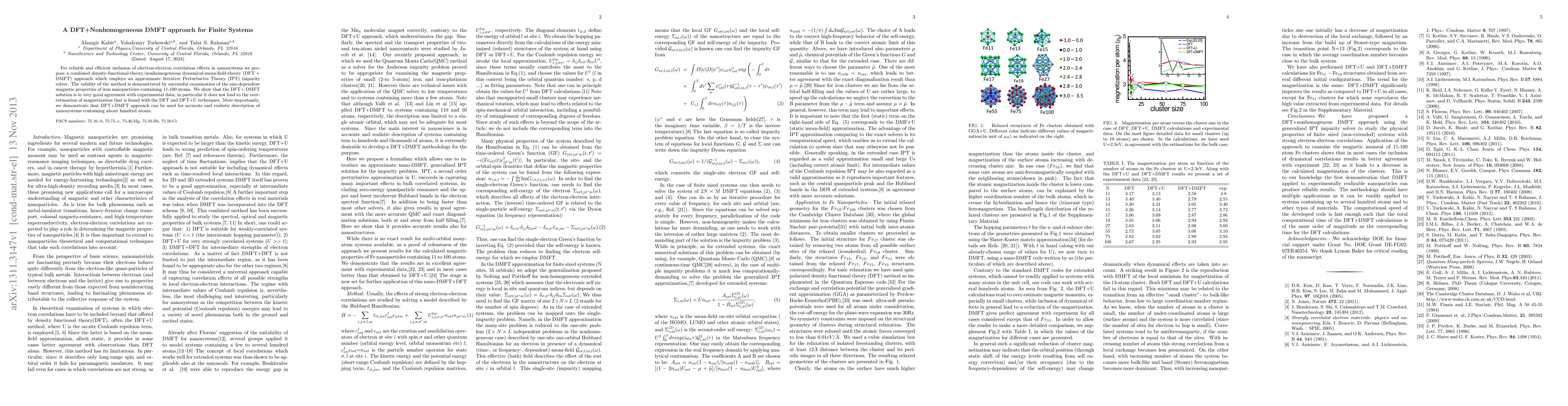 For reliable and efficient inclusion of electron-electron correlation effects in nanosystems we propose a combined density-functional-theory/nonhomogeneous dynamical-mean-field-theory (DFT + DMFT) approach which employs an approximate Iterative Perturbative Theory (IPT) impurity solver. The validity of the method is demonstrated by successful examination of the size-dependent magnetic properties of iron nanoparticles containing 11-100 atoms. We show that the DFT+ DMFT solution is in very good agreement with experimental data, in particular it does not lead to the overestimation of magnetization that is found with the DFT and DFT+U techniques. More importantly, we demonstrate that DFT+DMFT approach can be used for accurate and realistic description of nanosystems containing about hundred atoms.