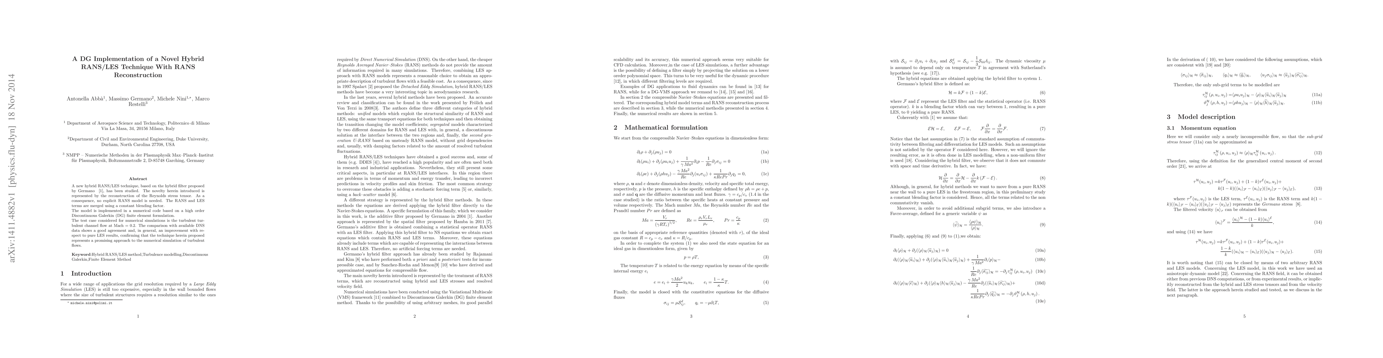 A new hybrid RANS/LES technique, based on the hybrid filter proposed by Germano in 2004, has been studied. The novelty herein introduced is represented by the reconstruction of the Reynolds stress tensor. As a consequence, no explicit RANS model is needed. The RANS and LES terms are merged using a constant blending factor. The model is implemented in a numerical code based on a high order Discontinuous Galerkin (DG) finite element formulation. The test case considered for numerical simulations is the turbulent tur- bulent channel flow at Mach = 0.2. The comparison with available DNS data shows a good agreement and, in general, an improvement with re- spect to pure LES results, confirming that the technique herein proposed represents a promising approach to the numerical simulation of turbulent flows.