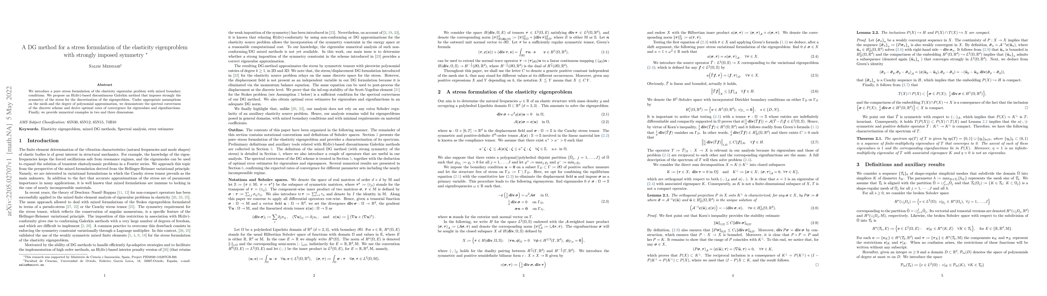 This paper proposes an H(div)-based discontinuous Galerkin method for solving the elasticity eigenproblem with mixed boundary conditions, strongly enforcing stress symmetry. The method demonstrates spectral correctness and optimal convergence rates, validated through numerical examples in 2D and 3D.