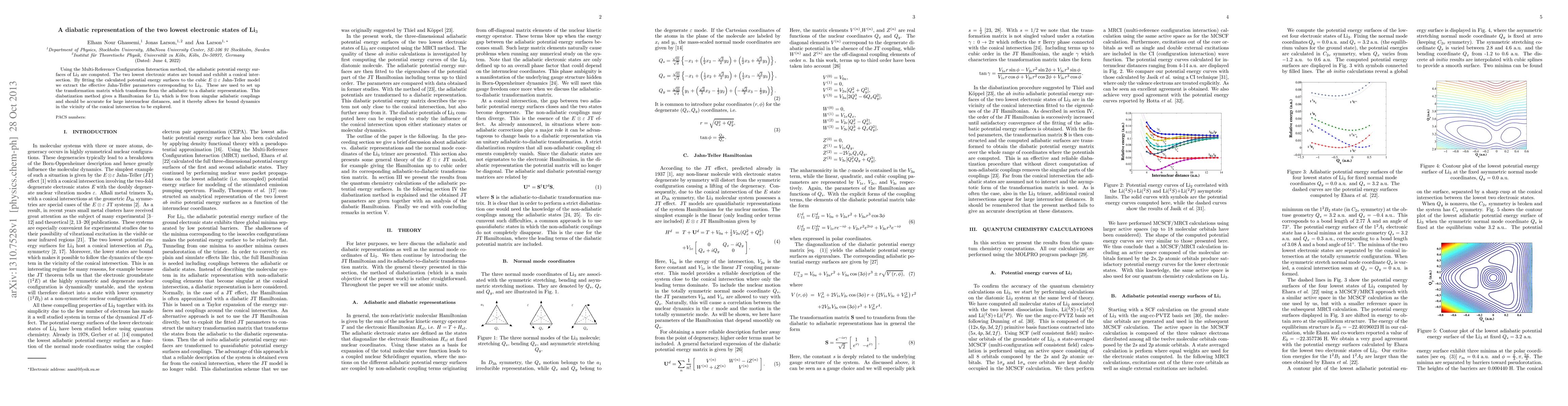 This study computes the adiabatic potential energy surfaces of Li3 using Multi-Reference Configuration Interaction, revealing a conical intersection between the two lowest bound electronic states. A diabatization method is developed to transform the adiabatic representation into a diabatic one, eliminating singular adiabatic couplings and enabling accurate exploration of dynamics near the conical intersection.