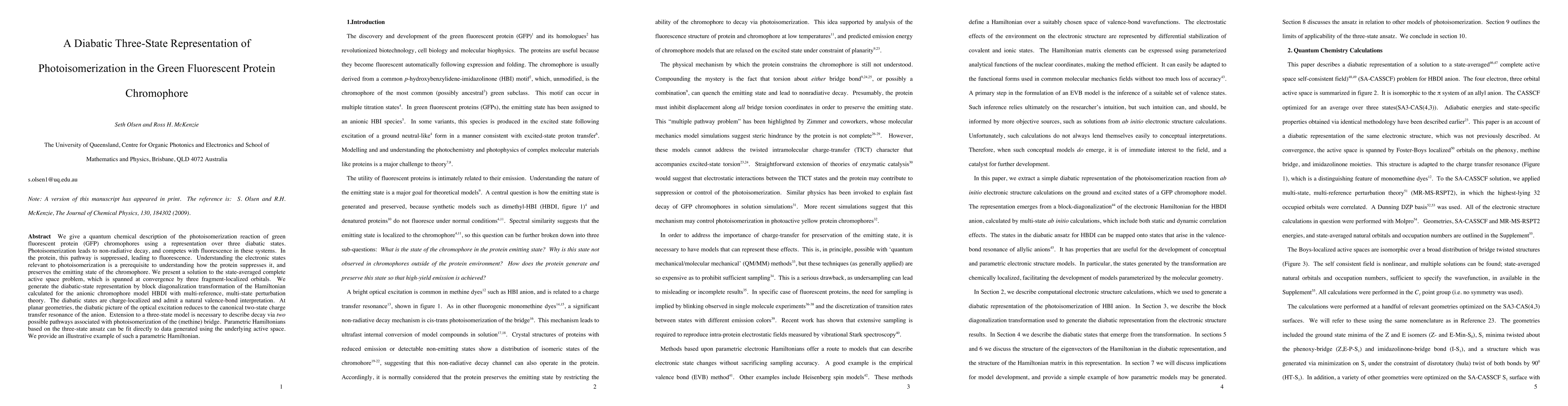 This paper presents a quantum chemical analysis of the photoisomerization reaction in green fluorescent protein chromophores using a three-diabatic-state representation. The study reveals how the protein suppresses non-radiative decay pathways, enabling fluorescence, and provides a parametric Hamiltonian model based on the three-state ansatz.