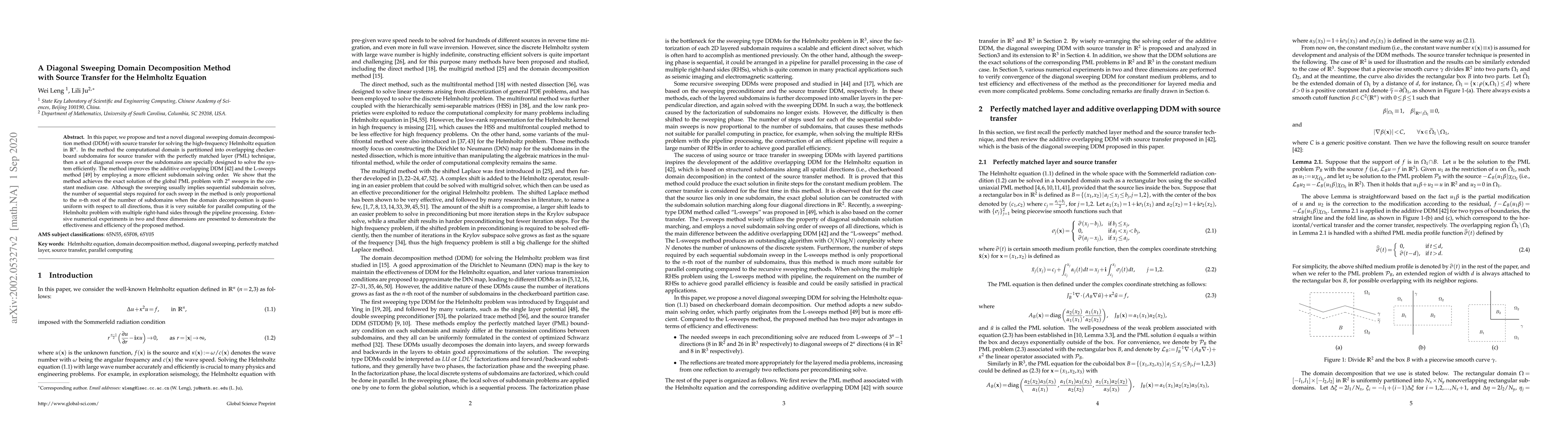 This paper introduces a novel diagonal sweeping domain decomposition method (DDM) with source transfer for solving high-frequency Helmholtz equations, utilizing overlapping checkerboard subdomains and PML techniques. The method achieves exact solutions with $2^n$ sweeps and is efficient for parallel computing, demonstrated through extensive numerical experiments.
