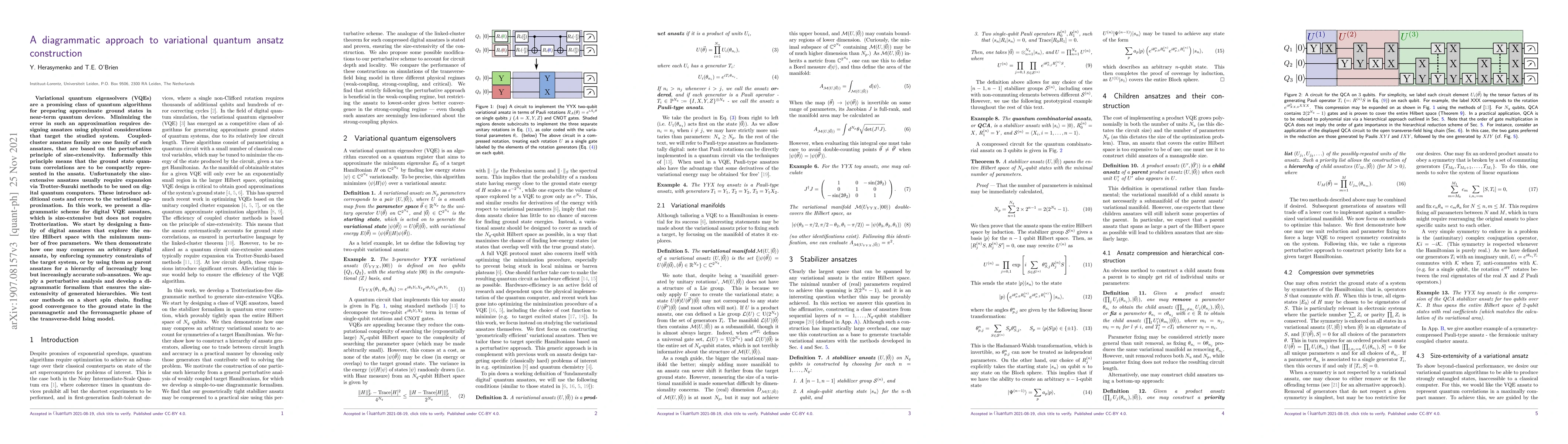 This paper introduces a diagrammatic method for constructing size-extensive variational quantum ansatzes for VQEs, avoiding the need for Trotterization and thus reducing computational costs and errors. The proposed approach generates ansatzes with minimal parameters and allows for the creation of hierarchical sub-ansatzes, tested successfully on the Ising model.