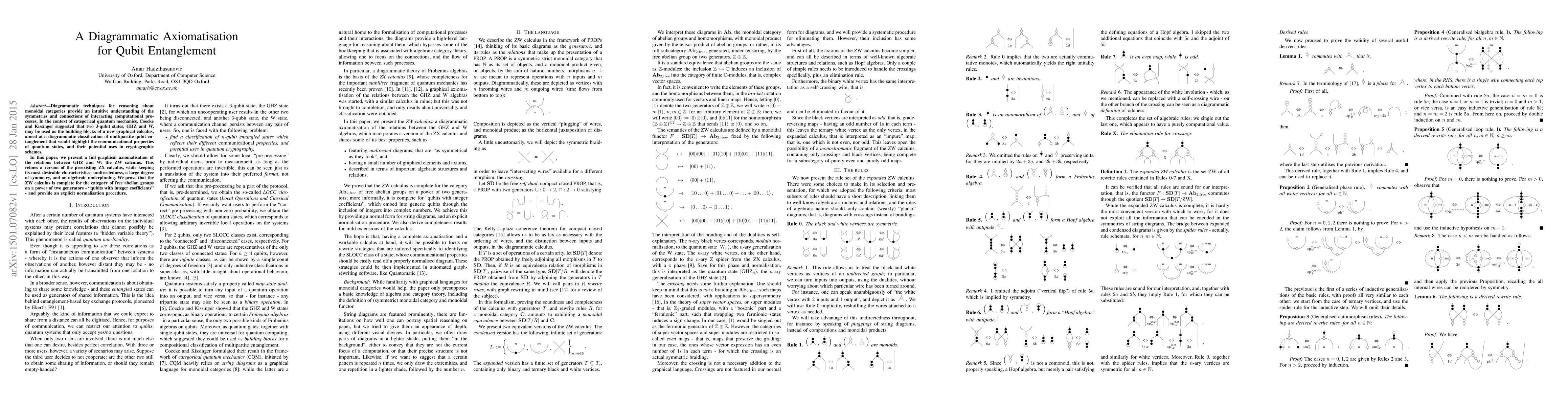 Diagrammatic techniques for reasoning about monoidal categories provide an intuitive understanding of the symmetries and connections of interacting computational processes. In the context of categorical quantum mechanics, Coecke and Kissinger suggested that two 3-qubit states, GHZ and W, may be used as the building blocks of a new graphical calculus, aimed at a diagrammatic classification of multipartite qubit entanglement that would highlight the communicational properties of quantum states, and their potential uses in cryptographic schemes. In this paper, we present a full graphical axiomatisation of the relations between GHZ and W: the ZW calculus. This refines a version of the preexisting ZX calculus, while keeping its most desirable characteristics: undirectedness, a large degree of symmetry, and an algebraic underpinning. We prove that the ZW calculus is complete for the category of free abelian groups on a power of two generators - "qubits with integer coefficients" - and provide an explicit normalisation procedure.