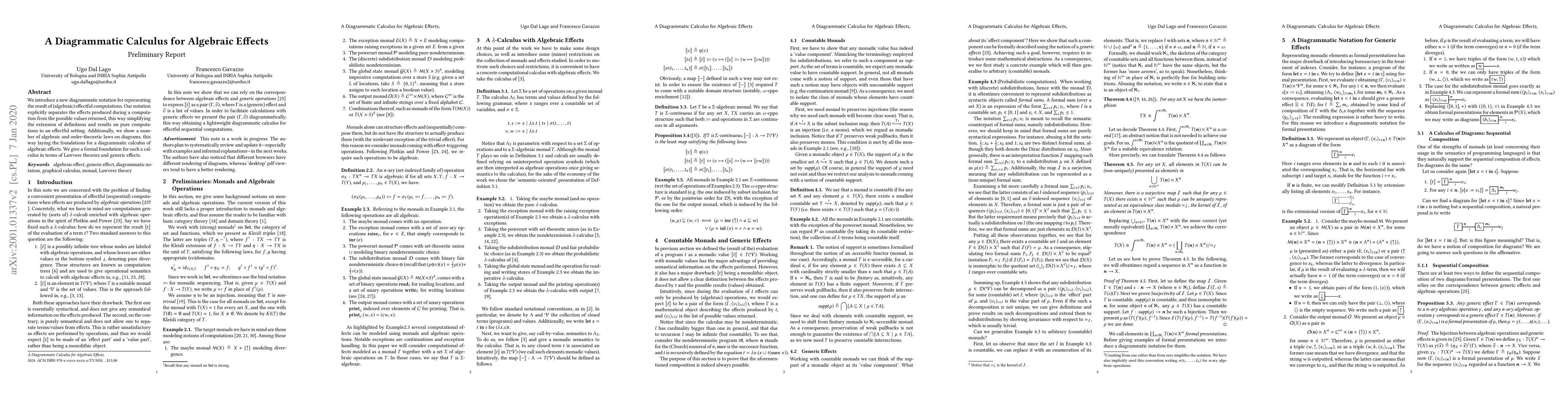 This paper introduces a diagrammatic notation to represent algebraic effectful computations, distinguishing effects from return values to simplify extensions to effectful settings. It also lays the foundation for a calculus of algebraic effects by establishing algebraic and order-theoretic laws on diagrams, supported by a formal foundation using Lawvere theories and generic effects.