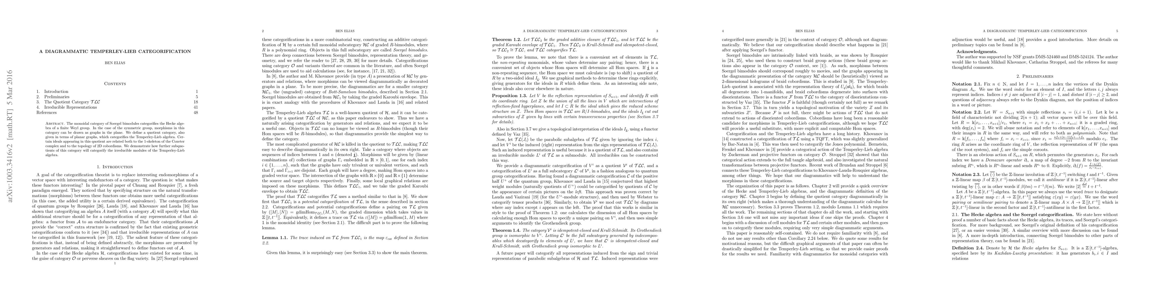 This paper constructs a diagrammatic categorification of the Temperley-Lieb algebra using planar graphs derived from Soergel bimodules, relating certain ideals to the Coxeter complex and 2D cobordisms, and outlines how further subquotients will categorify the cell modules.