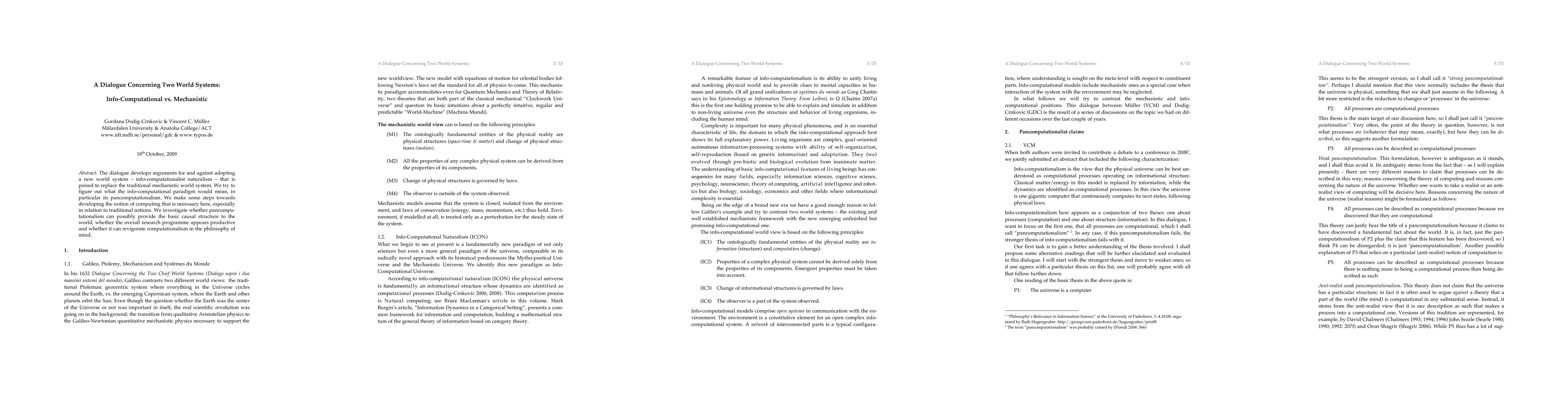 The dialogue develops arguments for and against adopting a new world system, info-computationalist naturalism, that is poised to replace the traditional mechanistic world system. We try to figure out what the info-computational paradigm would mean, in particular its pancomputationalism. We make some steps towards developing the notion of computing that is necessary here, especially in relation to traditional notions. We investigate whether pancomputationalism can possibly provide the basic causal structure to the world, whether the overall research programme appears productive and whether it can revigorate computationalism in the philosophy of mind.