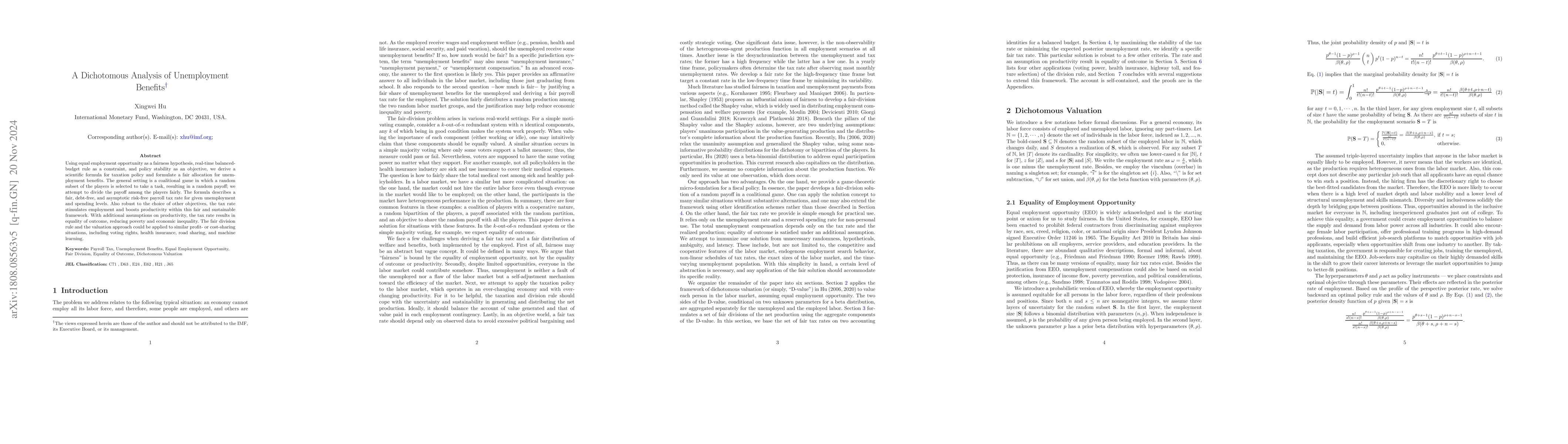 In an economy which could not accommodate the full employment of its labor force, it employs some labor but does not employ others. The bipartition of the labor force is random, and we characterize it by an axiom of equal employment opportunity. We value each employed individual by his or her marginal contribution to the production function; we also value each unemployed individual by the potential marginal contribution the person would make if the market hired the individual. We then use the aggregate individual value to distribute the net production to the unemployment welfare and the employment benefits. Using real-time balanced-budget rule as a constraint and policy stability as an objective, we derive a scientific formula which describes a fair, debt-free, and asymptotic risk-free tax rate for any given unemployment rate and national spending level. The tax rate minimizes the asymptotic mean, variance, semi-variance, and mean absolute deviation of the underlying posterior unemployment rate. The allocation rule stimulates employment and boosts productivity. Under some symmetry assumptions, we even find that an unemployed person should enjoy equivalent employment benefits, and the tax rate goes with this welfare equality. The tool employed is the cooperative game theory in which we assume many players. The players are randomly bipartitioned, and the payoff varies with the partition. One could apply the fair distribution rule and valuation approach to other profit-sharing or cost-sharing situations with these characteristics. This framework is open to alternative identification strategies and other forms of equal opportunity axiom.