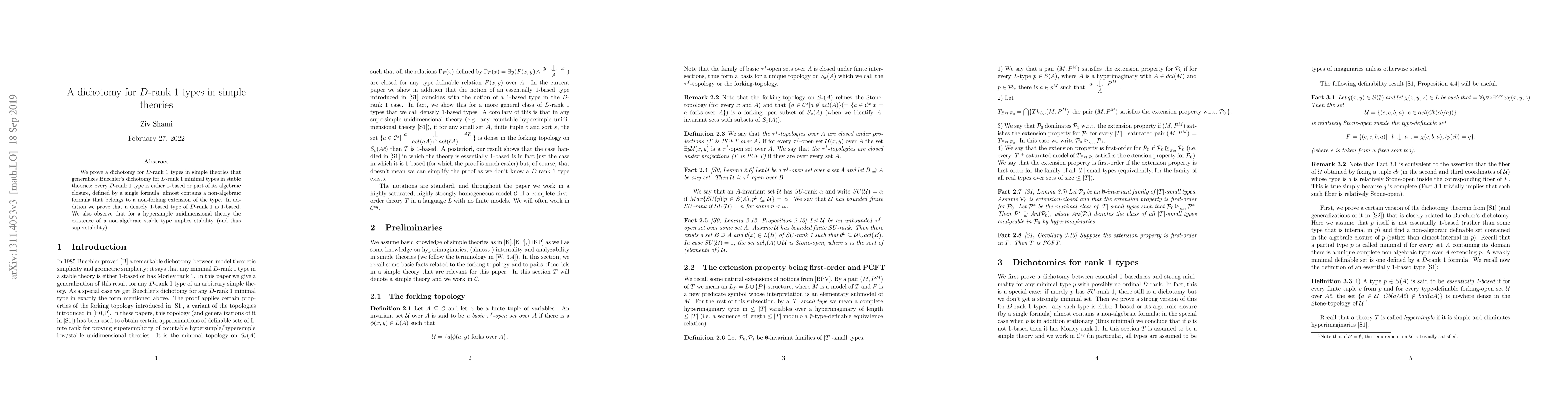 This paper establishes a dichotomy for $D$-rank 1 types in simple theories, showing that such types are either 1-based or part of their algebraic closure defined by a single formula. It also proves that densely 1-based $D$-rank 1 types are 1-based and notes that for hypersimple unidimensional theories, the existence of a non-algebraic stable type implies stability.
