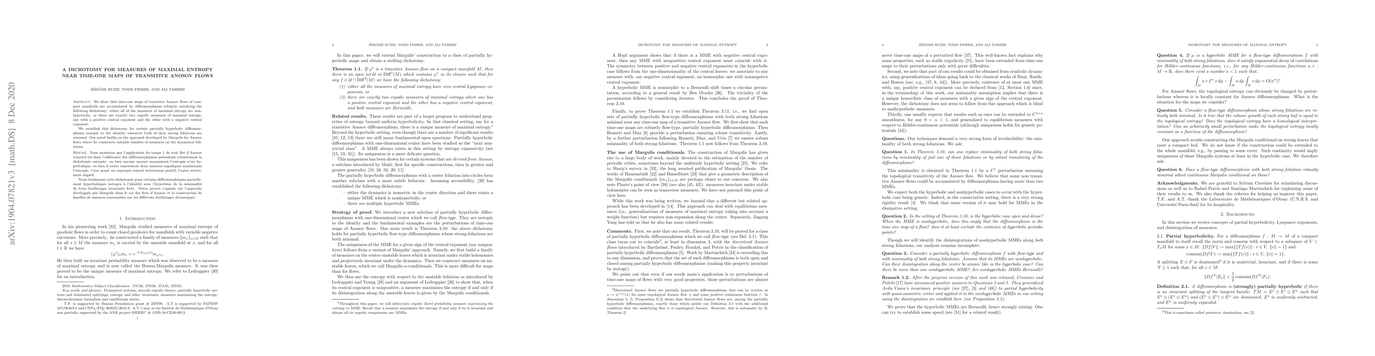 **Summary:** This paper demonstrates a dichotomy for maximal entropy measures near time-one maps of transitive Anosov flows, showing that they are either non-hyperbolic or precisely two ergodic measures exist, one with a positive central exponent and one with a negative central exponent. The proof leverages Margulis's approach for constructing measures on dynamical foliations.