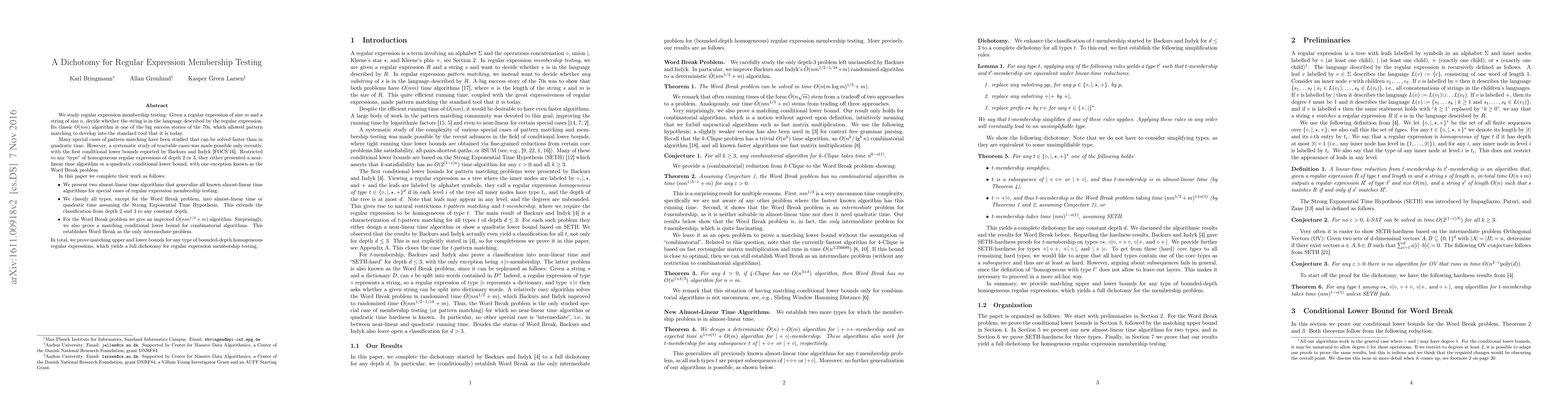 We study regular expression membership testing: Given a regular expression of size $m$ and a string of size $n$, decide whether the string is in the language described by the regular expression. Its classic $O(nm)$ algorithm is one of the big success stories of the 70s, which allowed pattern matching to develop into the standard tool that it is today. Many special cases of pattern matching have been studied that can be solved faster than in quadratic time. However, a systematic study of tractable cases was made possible only recently, with the first conditional lower bounds reported by Backurs and Indyk [FOCS'16]. Restricted to any "type" of homogeneous regular expressions of depth 2 or 3, they either presented a near-linear time algorithm or a quadratic conditional lower bound, with one exception known as the Word Break problem. In this paper we complete their work as follows: 1) We present two almost-linear time algorithms that generalize all known almost-linear time algorithms for special cases of regular expression membership testing. 2) We classify all types, except for the Word Break problem, into almost-linear time or quadratic time assuming the Strong Exponential Time Hypothesis. This extends the classification from depth 2 and 3 to any constant depth. 3) For the Word Break problem we give an improved $\tilde{O}(n m^{1/3} + m)$ algorithm. Surprisingly, we also prove a matching conditional lower bound for combinatorial algorithms. This establishes Word Break as the only intermediate problem. In total, we prove matching upper and lower bounds for any type of bounded-depth homogeneous regular expressions, which yields a full dichotomy for regular expression membership testing.