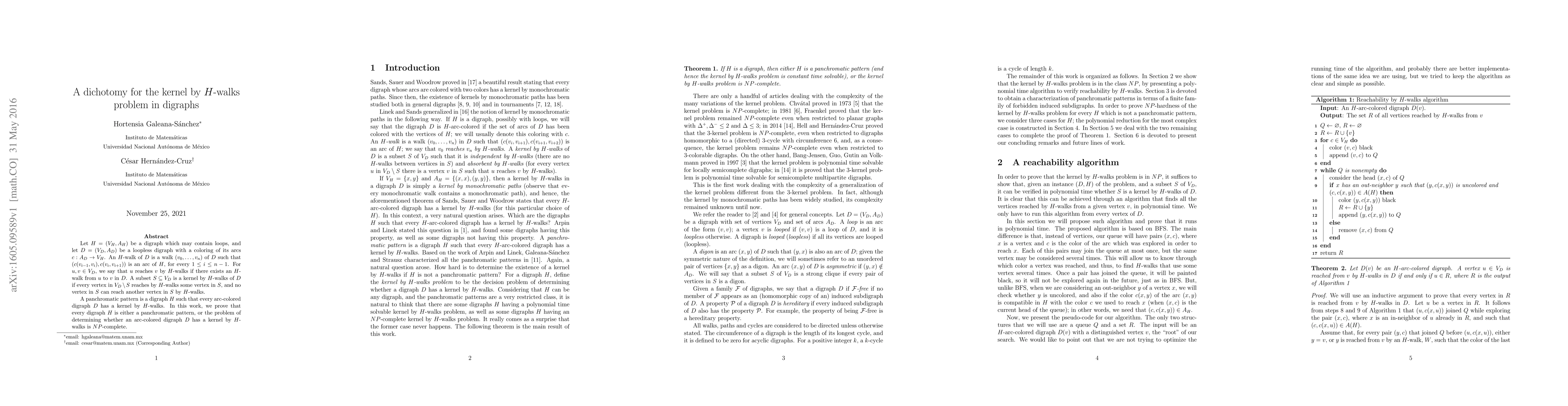 Let $H = (V_H, A_H)$ be a digraph which may contain loops, and let $D = (V_D, A_D)$ be a loopless digraph with a coloring of its arcs $c: A_D \to V_H$. An $H$-walk of $D$ is a walk $(v_0, \dots, v_n)$ of $D$ such that $(c(v_{i-1}, v_i), c(v_i, v_{i+1}))$ is an arc of $H$, for every $1 \le i \le n-1$. For $u, v \in V_D$, we say that $u$ reaches $v$ by $H$-walks if there exists an $H$-walk from $u$ to $v$ in $D$. A subset $S \subseteq V_D$ is a kernel by $H$-walks of $D$ if every vertex in $V_D \setminus S$ reaches by $H$-walks some vertex in $S$, and no vertex in $S$ can reach another vertex in $S$ by $H$-walks. A panchromatic pattern is a digraph $H$ such that every arc-colored digraph $D$ has a kernel by $H$-walks. In this work, we prove that every digraph $H$ is either a panchromatic pattern, or the problem of determining whether an arc-colored digraph $D$ has a kernel by $H$-walks is $NP$-complete.