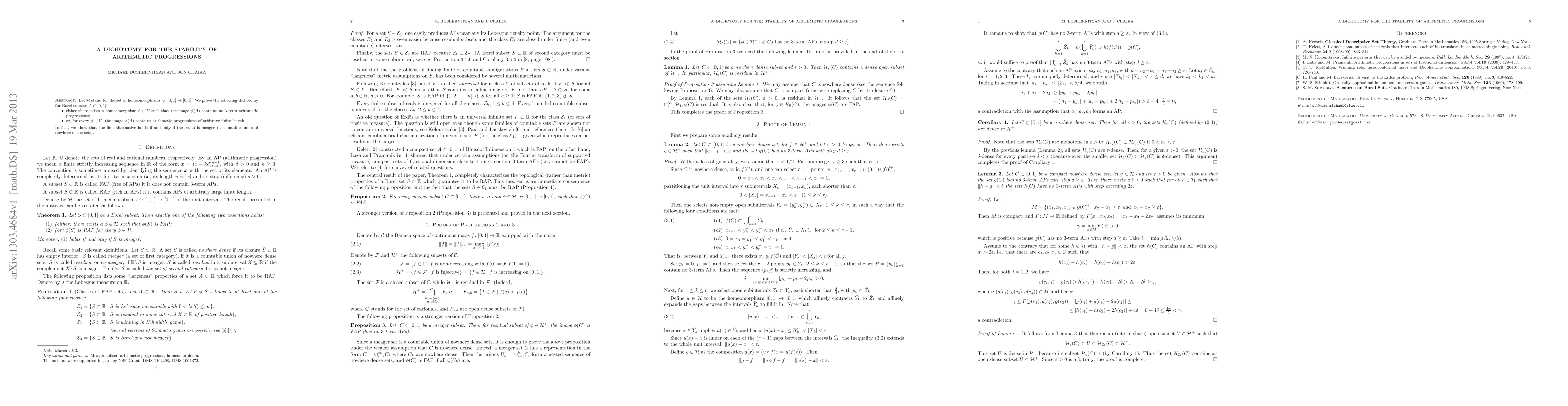 This paper proves a dichotomy for Borel subsets A of [0,1]: either there exists a homeomorphism that maps A to a set without 3-term arithmetic progressions, or every homeomorphism maps A to a set containing progressions of any finite length. The first case holds if and only if A is meager.