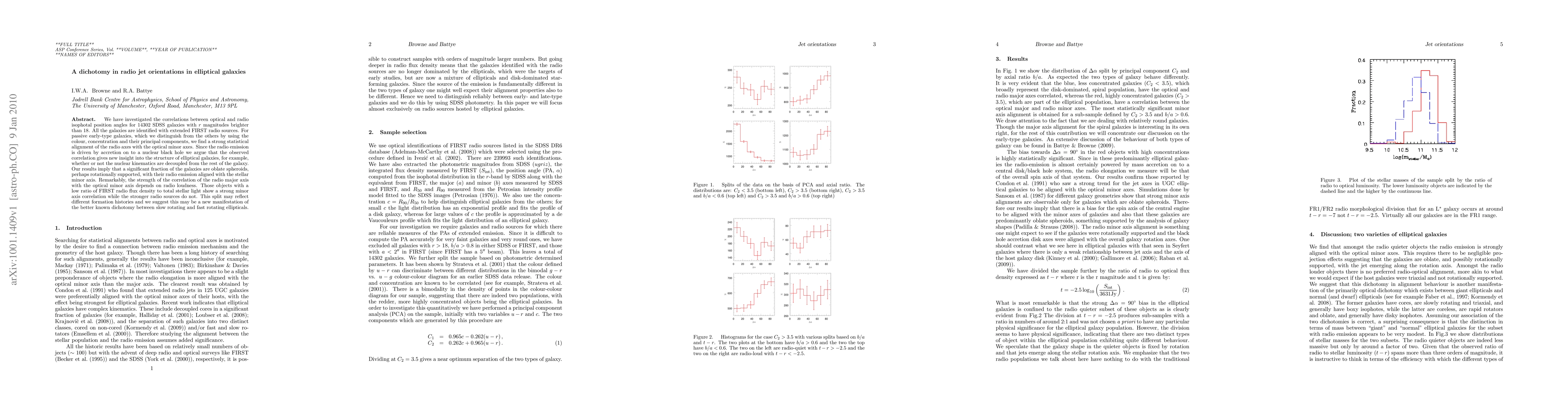We have investigated the correlations between optical and radio isophotal position angles for 14302 SDSS galaxies with r magnitudes brighter than 18. All the galaxies are identified with extended FIRST radio sources. For passive early-type galaxies, which we distinguish from the others by using the colour, concentration and their principal components, we find a strong statistical alignment of the radio axes with the optical minor axes. Since the radio emission is driven by accretion on to a nuclear black hole we argue that the observed correlation gives new insight into the structure of elliptical galaxies, for example, whether or not the nuclear kinematics are decoupled from the rest of the galaxy. Our results imply that a significant fraction of the galaxies are oblate spheroids, perhaps rotationally supported, with their radio emission aligned with the stellar minor axis. Remarkably, the strength of the correlation of the radio major axis with the optical minor axis depends on radio loudness. Those objects with a low ratio of FIRST radio flux density to total stellar light show a strong minor axis correlation while the stronger radio sources do not. This split may reflect different formation histories and we suggest this may be a new manifestation of the better known dichotomy between slow rotating and fast rotating ellipticals.