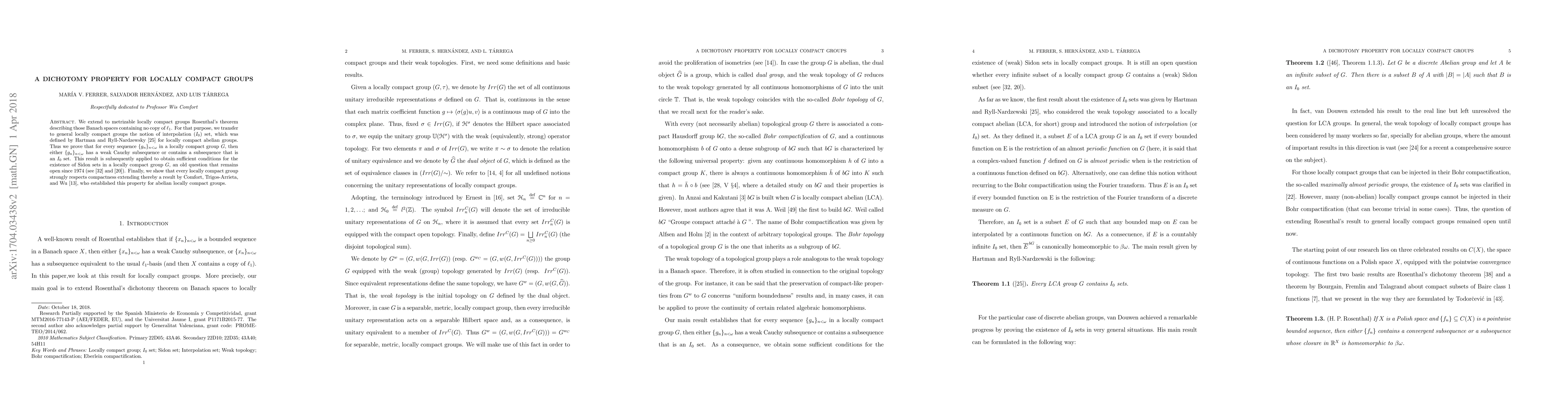 This paper extends Rosenthal's theorem on Banach spaces to metrizable locally compact groups by introducing the interpolation ($I_0$) set concept, proving a dichotomy property, and applying it to find conditions for Sidon sets and confirm strong respect for compactness in locally compact groups.