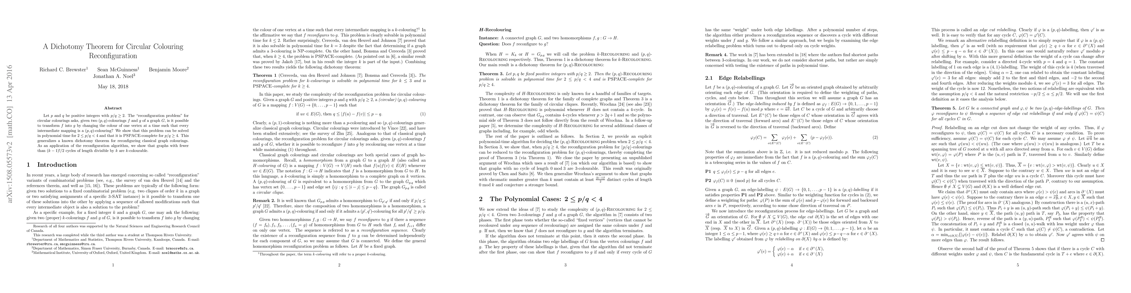 The paper presents a dichotomy theorem for the reconfiguration problem of circular colourings, proving it can be solved in polynomial time when the ratio of $p$ to $q$ is between 2 and 4, and is PSPACE-complete when this ratio is 4 or greater. This extends existing results on reconfiguring classical graph colourings.