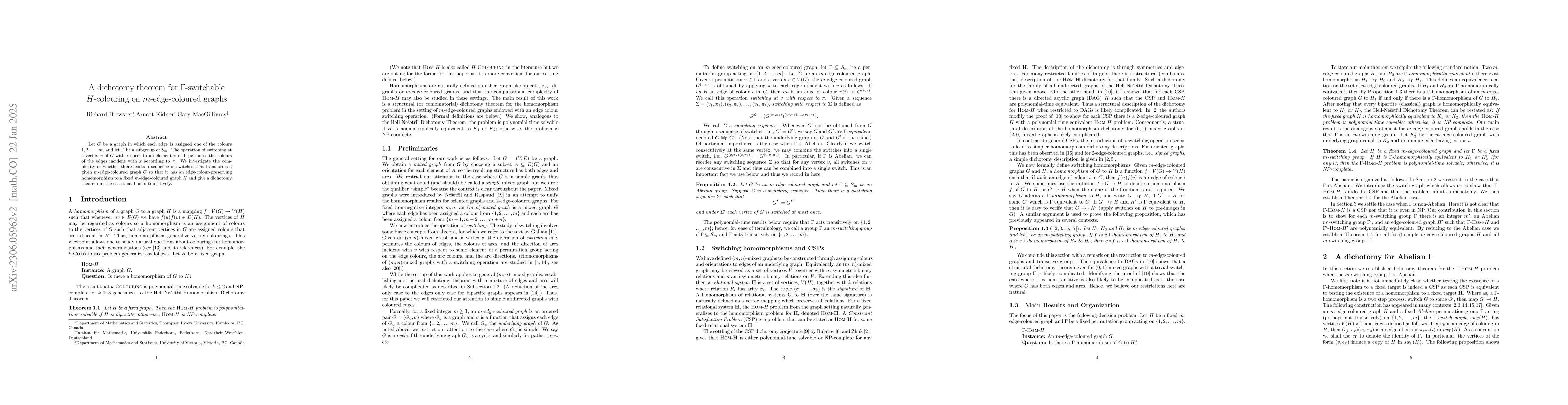 This paper explores the complexity of transforming an $m$-edge coloured graph $G$ through $\Gamma$-switchable operations to achieve a colour-preserving homomorphism to a fixed graph $H$, proving a dichotomy theorem when $\Gamma$ acts transitively. The study focuses on the conditions under which such transformations are possible.