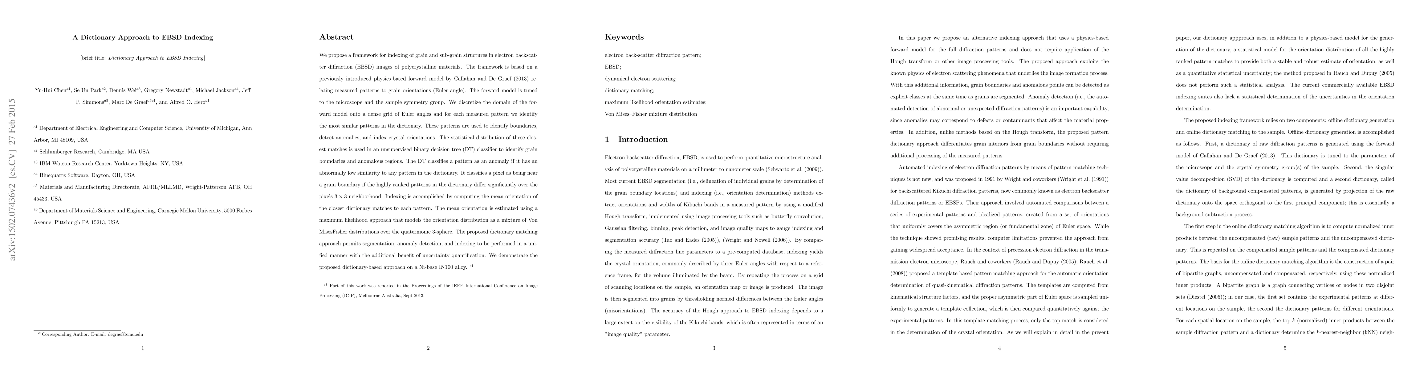 We propose a framework for indexing of grain and sub-grain structures in electron backscatter diffraction (EBSD) images of polycrystalline materials. The framework is based on a previously introduced physics-based forward model by Callahan and De Graef (2013) relating measured patterns to grain orientations (Euler angle). The forward model is tuned to the microscope and the sample symmetry group. We discretize the domain of the forward model onto a dense grid of Euler angles and for each measured pattern we identify the most similar patterns in the dictionary. These patterns are used to identify boundaries, detect anomalies, and index crystal orientations. The statistical distribution of these closest matches is used in an unsupervised binary decision tree (DT) classifier to identify grain boundaries and anomalous regions. The DT classifies a pattern as an anomaly if it has an abnormally low similarity to any pattern in the dictionary. It classifies a pixel as being near a grain boundary if the highly ranked patterns in the dictionary differ significantly over the pixels 3x3 neighborhood. Indexing is accomplished by computing the mean orientation of the closest dictionary matches to each pattern. The mean orientation is estimated using a maximum likelihood approach that models the orientation distribution as a mixture of Von Mises-Fisher distributions over the quaternionic 3-sphere. The proposed dictionary matching approach permits segmentation, anomaly detection, and indexing to be performed in a unified manner with the additional benefit of uncertainty quantification. We demonstrate the proposed dictionary-based approach on a Ni-base IN100 alloy.