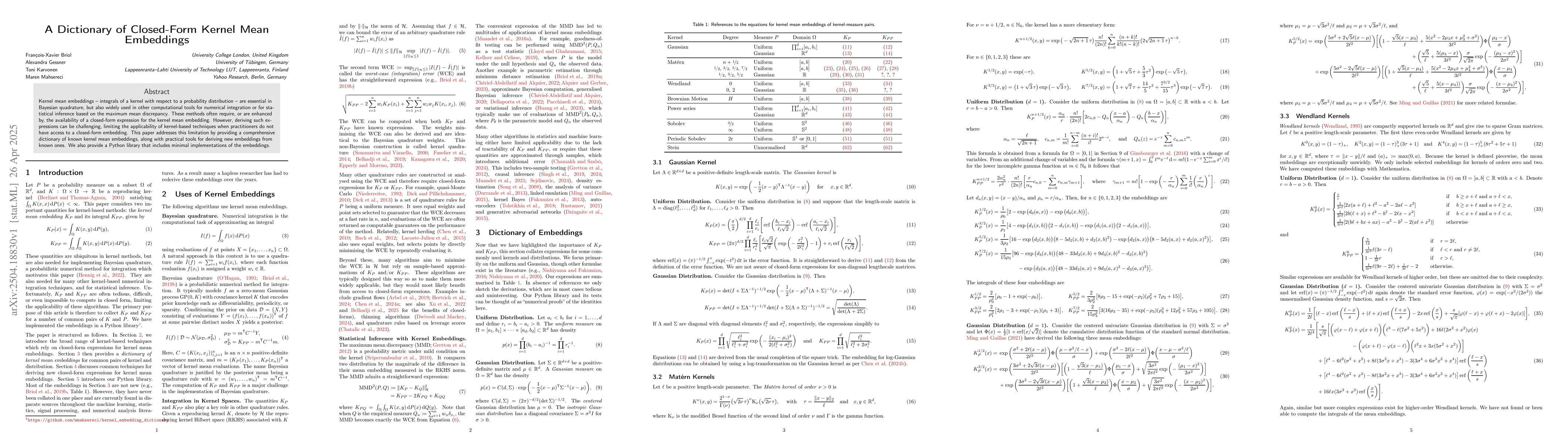 The paper presents a comprehensive dictionary of known kernel mean embeddings, along with tools for deriving new embeddings, and provides a Python library for minimal implementations.