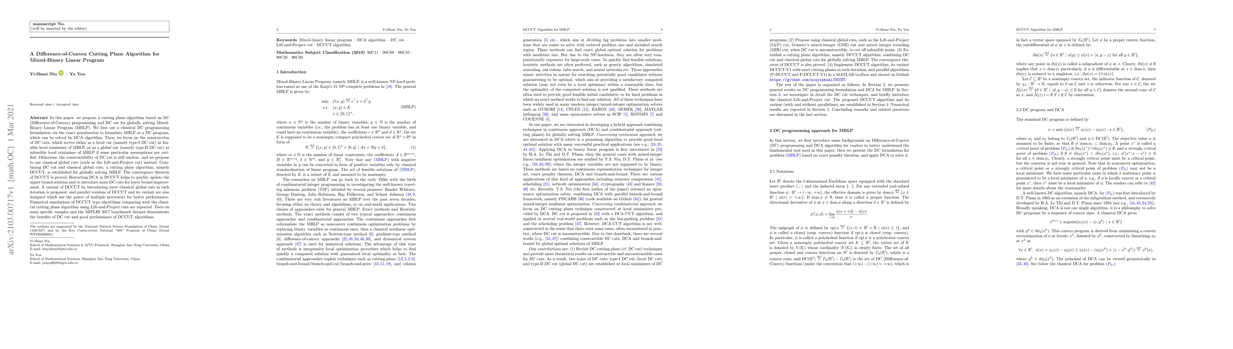 This paper proposes a cutting plane algorithm, DCCUT, for solving Mixed-Binary Linear Programs (MBLP) using Difference-of-Convex (DC) programming and DC cuts. The algorithm combines DC cuts with classical global cuts and demonstrates good performance through numerical simulations and benchmark tests.