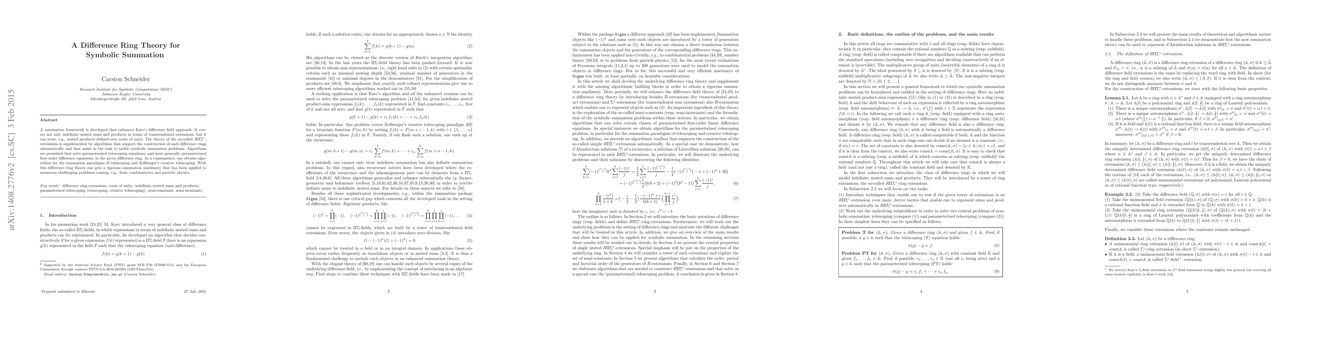 A summation framework is developed that enhances Karr's difference field approach. It covers not only indefinite nested sums and products in terms of transcendental extensions, but it can treat, e.g., nested products defined over roots of unity. The theory of the so-called $R\Pi\Sigma^*$-extensions is supplemented by algorithms that support the construction of such difference rings automatically and that assist in the task to tackle symbolic summation problems. Algorithms are presented that solve parameterized telescoping equations, and more generally parameterized first-order difference equations, in the given difference ring. As a consequence, one obtains algorithms for the summation paradigms of telescoping and Zeilberger's creative telescoping. With this difference ring theory one obtains a rigorous summation machinery that has been applied to numerous challenging problems coming, e.g., from combinatorics and particle physics.