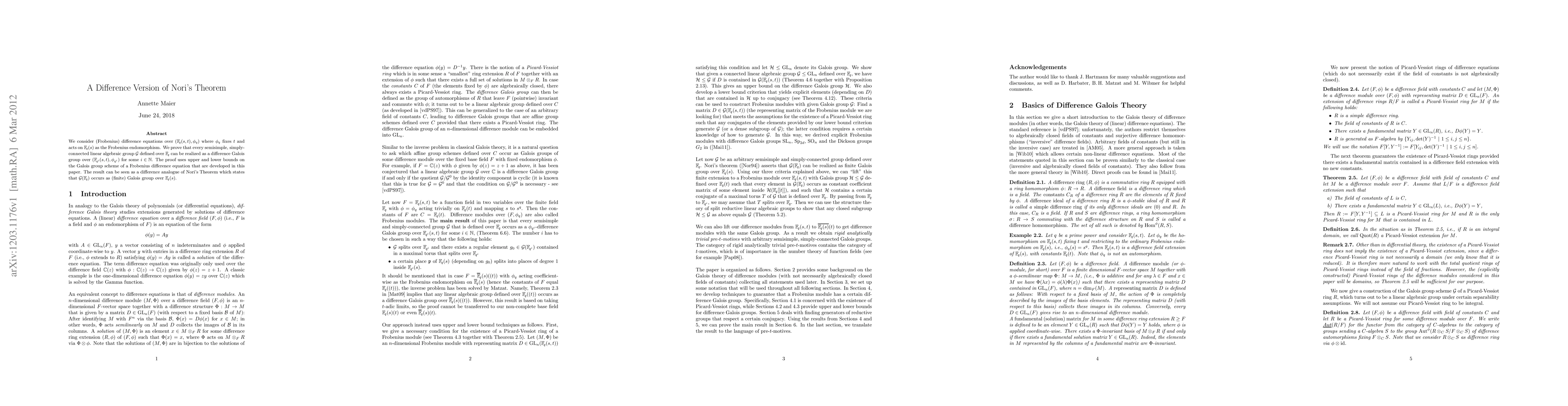 We consider (Frobenius) difference equations over (F_q(s,t), phi) where phi fixes t and acts on F_q(s) as the Frobenius endomorphism. We prove that every semisimple, simply-connected linear algebraic group G defined over F_q can be realized as a difference Galois group over F_{q^i}(s,t) for some i in N. The proof uses upper and lower bounds on the Galois group scheme of a Frobenius difference equation that are developed in this paper. The result can be seen as a difference analogue of Nori's Theorem which states that G(F_q) occurs as (finite) Galois group over F_q(s).