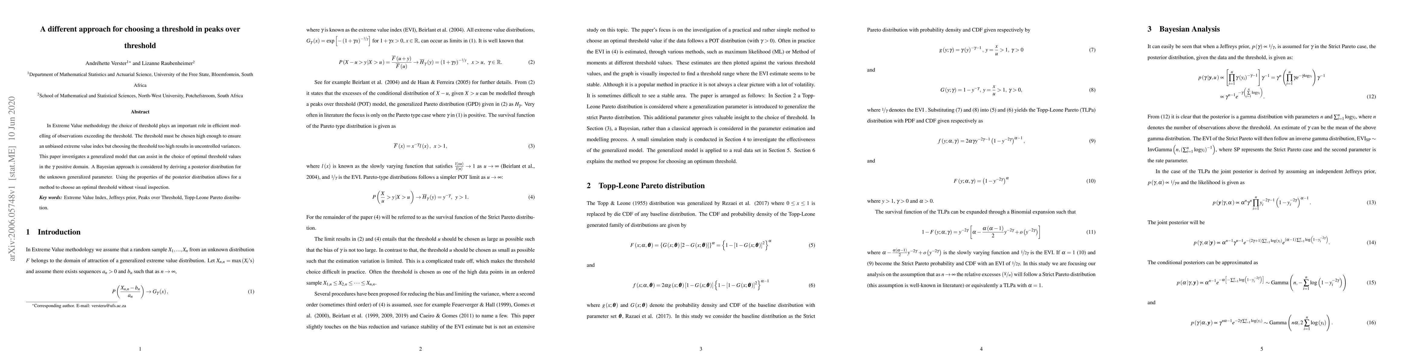 Abstract In Extreme Value methodology the choice of threshold plays an important role in efficient modelling of observations exceeding the threshold. The threshold must be chosen high enough to ensure an unbiased extreme value index but choosing the threshold too high results in uncontrolled variances. This paper investigates a generalized model that can assist in the choice of optimal threshold values in the \gamma positive domain. A Bayesian approach is considered by deriving a posterior distribution for the unknown generalized parameter. Using the properties of the posterior distribution allows for a method to choose an optimal threshold without visual inspection.