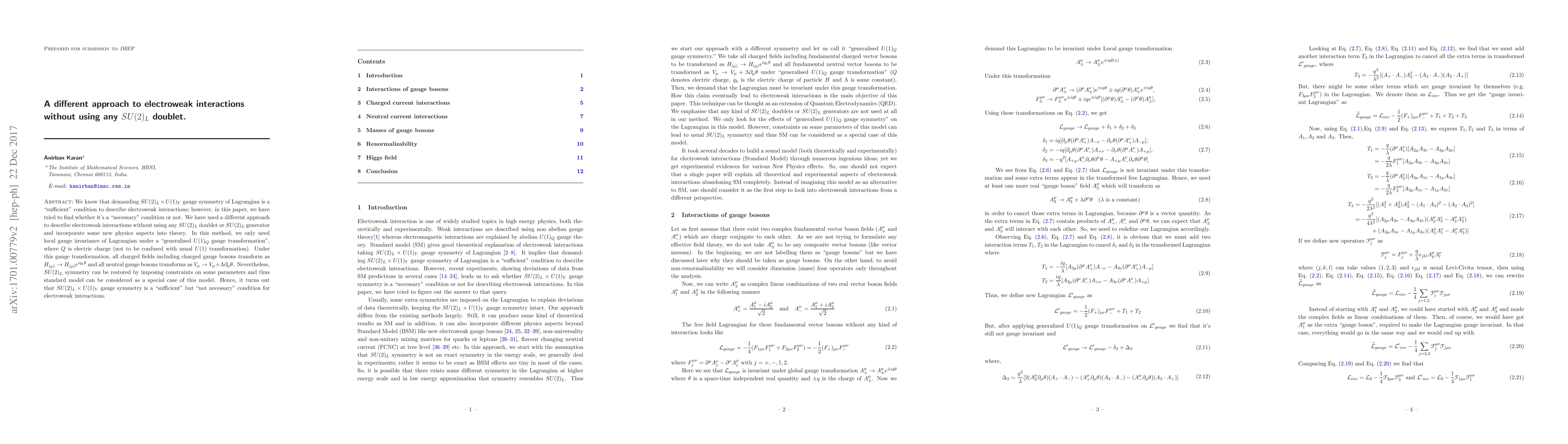 We know that demanding $SU(2)_L\times U(1)_Y$ gauge symmetry of Lagrangian is a "sufficient" condition to describe electroweak interactions, however, in this paper, we have tried to find whether it's a "necessary" condition or not. We have used a different approach to describe electroweak interactions without using any $SU(2)_L$ doublet or $SU(2)_L$ generator and incorporate some new physics aspects into theory. In this method, we only need local gauge invariance of Lagrangian under a "generalised $U(1)_Q$ gauge transformation", where $Q$ is electric charge (not to be confused with usual $U(1)$ transformation). Under this gauge transformation, all charged fields including charged gauge bosons transform as $H_{(\mu)}\rightarrow H_{(\mu)}e^{iq_h\theta}$ and all neutral gauge bosons transforms as $V_\mu\rightarrow V_\mu+\Lambda \partial_\mu \theta$. Nevertheless, $SU(2)_L$ symmetry can be restored by imposing constraints on some parameters and thus standard model can be considered as a special case of this model. Hence, it turns out that $SU(2)_L\times U(1)_Y$ gauge symmetry is a "sufficient" but "not necessary" condition for electroweak interactions.