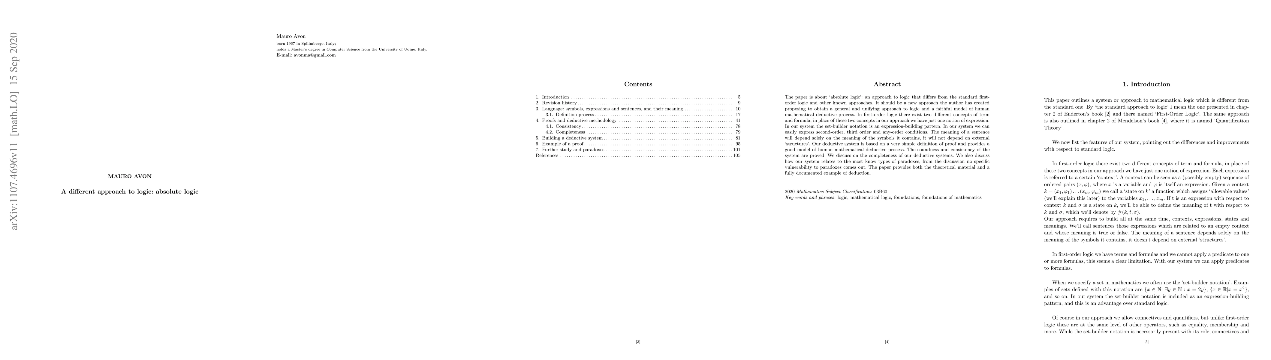 The paper is about 'absolute logic': an approach to logic that differs from the standard first-order logic and other known approaches. It should be a new approach the author has created proposing to obtain a general and unifying approach to logic and a faithful model of human mathematical deductive process. In first-order logic there exist two different concepts of term and formula, in place of these two concepts in our approach we have just one notion of expression. In our system the set-builder notation is an expression-building pattern. In our system we can easily express second-order, third order and any-order conditions. The meaning of a sentence will depend solely on the meaning of the symbols it contains, it will not depend on external 'structures'. Our deductive system is based on a very simple definition of proof and provides a good model of human mathematical deductive process. The soundness and consistency of the system are proved. We discuss on the completeness of our deductive systems. We also discuss how our system relates to the most know types of paradoxes, from the discussion no specific vulnerability to paradoxes comes out. The paper provides both the theoretical material and a fully documented example of deduction.